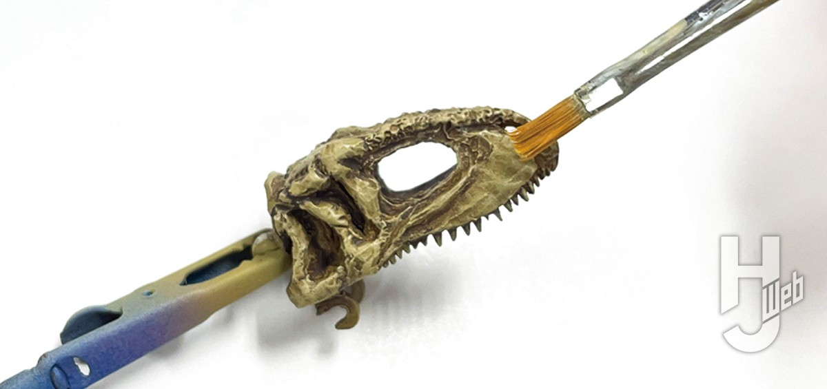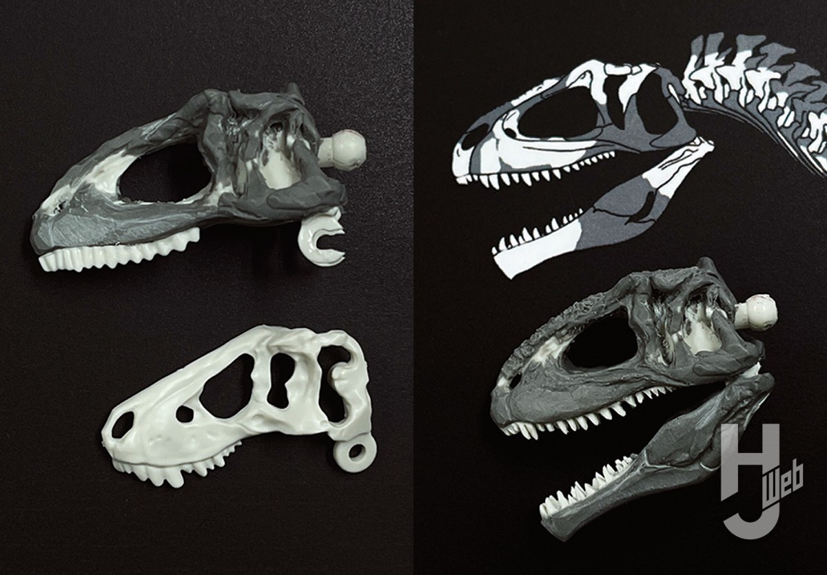 ▲本体色より明るめの色を調色し、ドライブラシ。ギガノトサウルスの頭骨は細かな凹凸が集中しており、ウォッシングやドライブラシがとてもよく映える。歯は本体色より暗めの色(ツヤあり)で塗装すると、ギガノトサウルスのホロタイプでも保存されていたエナメル質風になってよいアクセントになる
