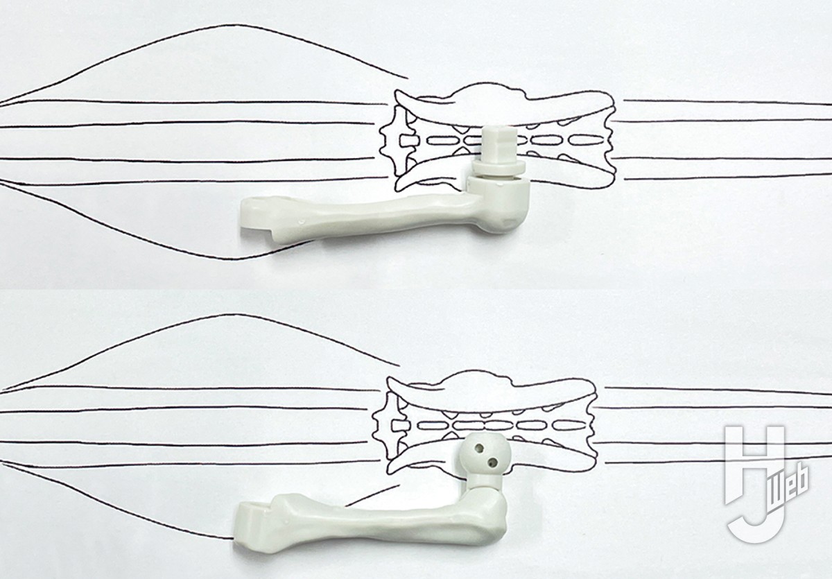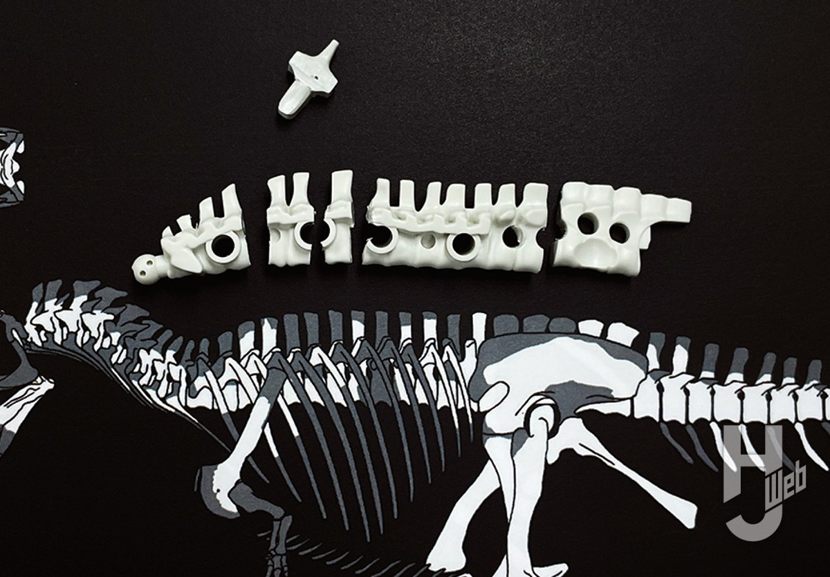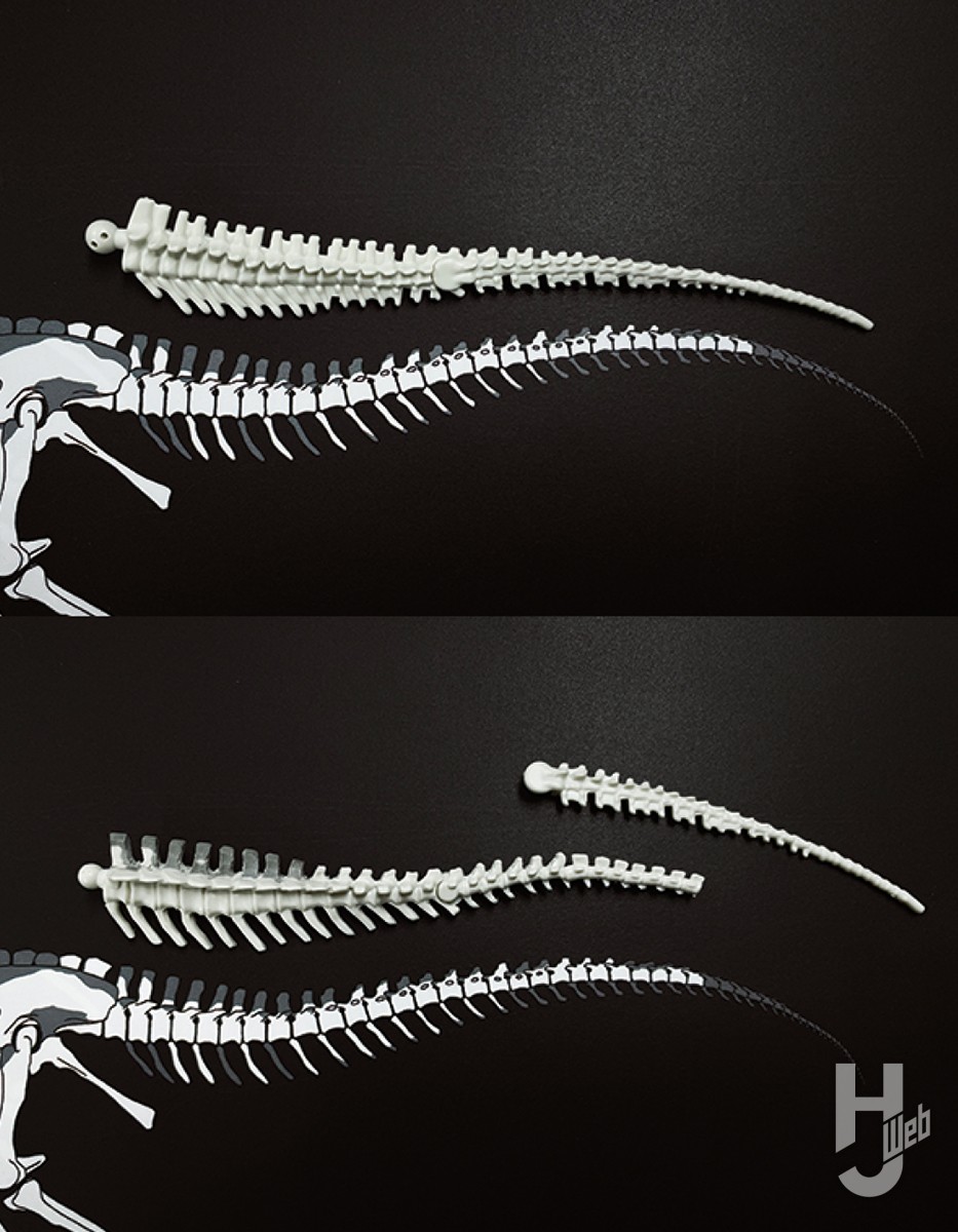 ▲キットの骨格ビルドは単に胴椎が1個多いだけでなく、個別の胴椎がところどころ前後にやや長いようだ。胴椎ブロックを適当なところで切り分け、胴椎を1個取り除く。切り分けたブロックを削り込んで前後長を短縮したら、金属線を通して組み直そう