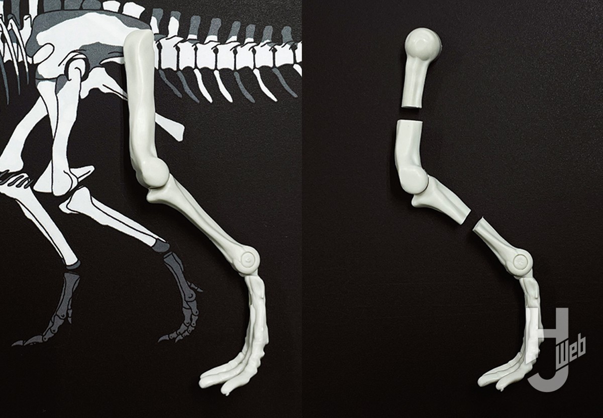 ▲ギガノトサウルスをはじめとするカルカロドントサウルス科は、ティラノサウルス科と比べて後肢がずっと短い。キットの大腿骨と脛骨を切断し、骨格図を参考に長さを調整する。大腿骨の上半分はテリジノサウルスのものを接着する