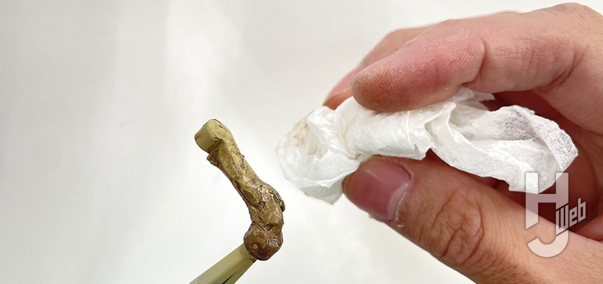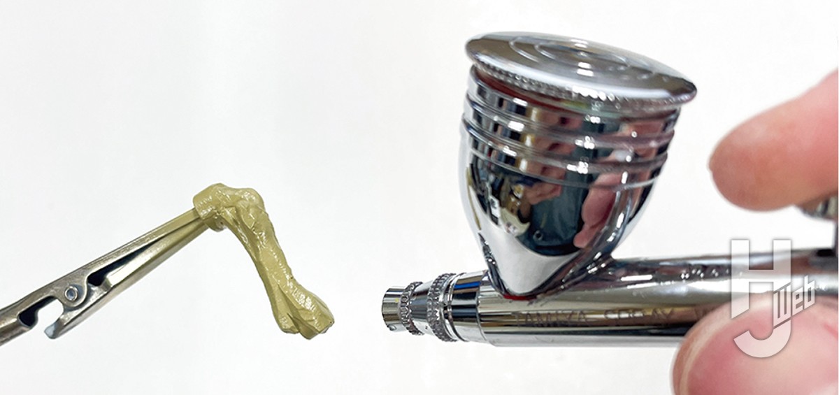 ▲塗装の前に、溶きパテを全体に塗っておこう。こうすると化石風のテクスチャーになり、非常に塗装映えがする。各地で展示されている復元骨格は黒~茶色系のカラーリングがほとんどだが、実際のホロタイプはダークイエローに近い。それらしく調色したものをエアブラシで全体に吹く