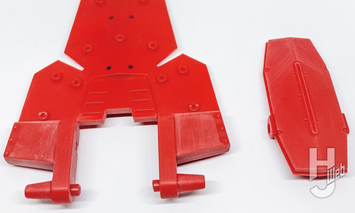 腰パーツの合わせ目も意外に気になるので、処理後に目立たない後ろ側のラインでカットし取り付けました。加えて腰のリアアーマーになるウイングパーツは取り付け部を切り欠いて後ハメしています。
