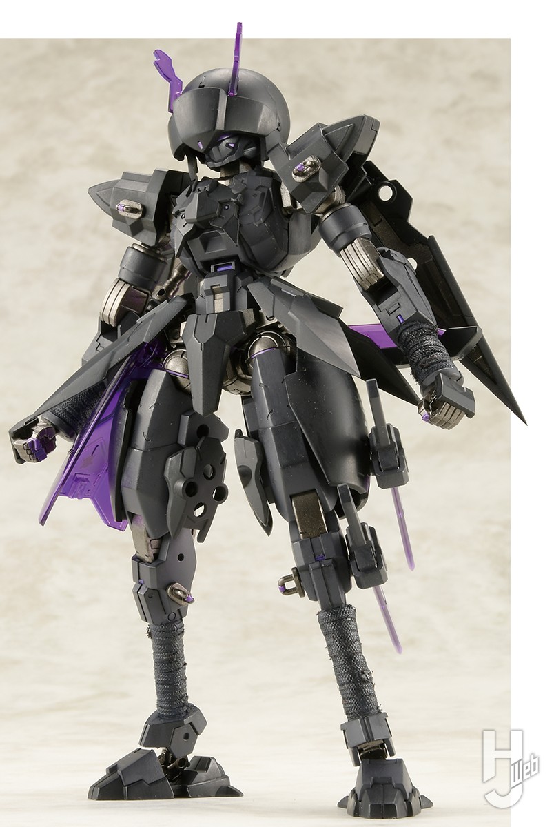 紫のクリアーパーツを活かしたカラーリングにするため、Ex-ブラックとインナーブラックの2色を使い分けて黒系でまとめています。紫のメタリックな差し色はDSPIAEの水性アクリルマーカーで塗り分けています。落ち着いた“忍び”の雰囲気を残しながら怪しさを表現するために、関節などのガンメタはツヤを消さずクリアーのトップコートを使用しています。仕上げに水性塗料の黒でドライブラシをかけアーマーの使用感や細かな傷を表現してみました。