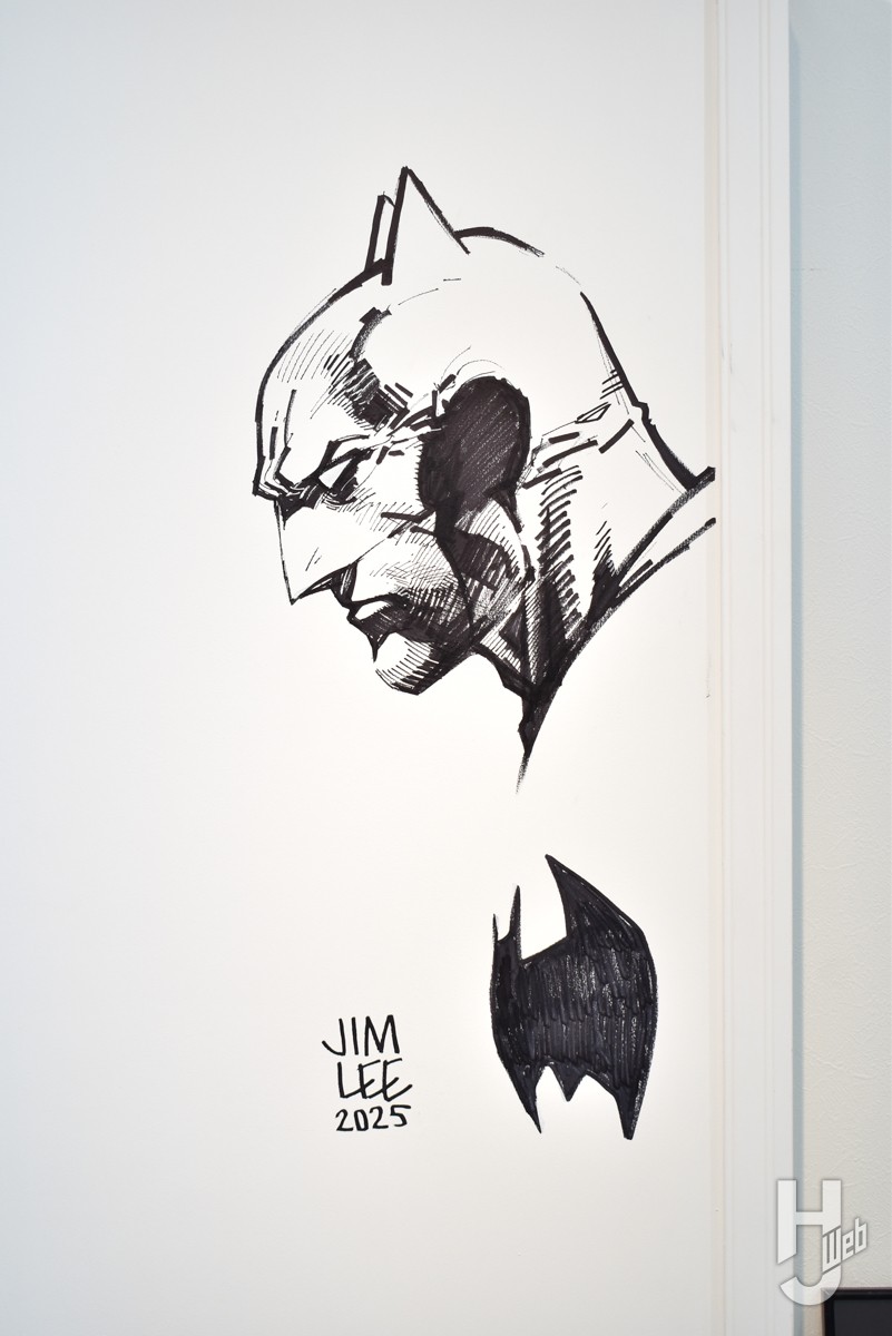 プライム1スタジオ本社に用意されたギャラリーには、新作ハイエンドスタチューやフィギュアが所狭しと立ち並ぶ。ギャラリーの壁には『バットマン:ハッシュ』で知られるアメコミ作家、ジム・リー氏の直筆サインも。