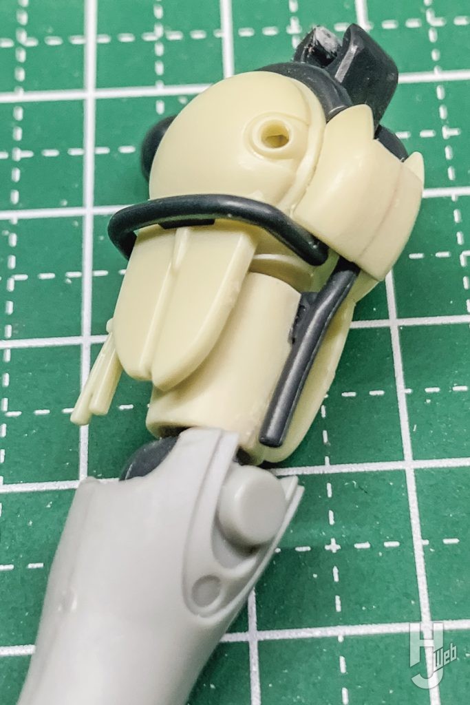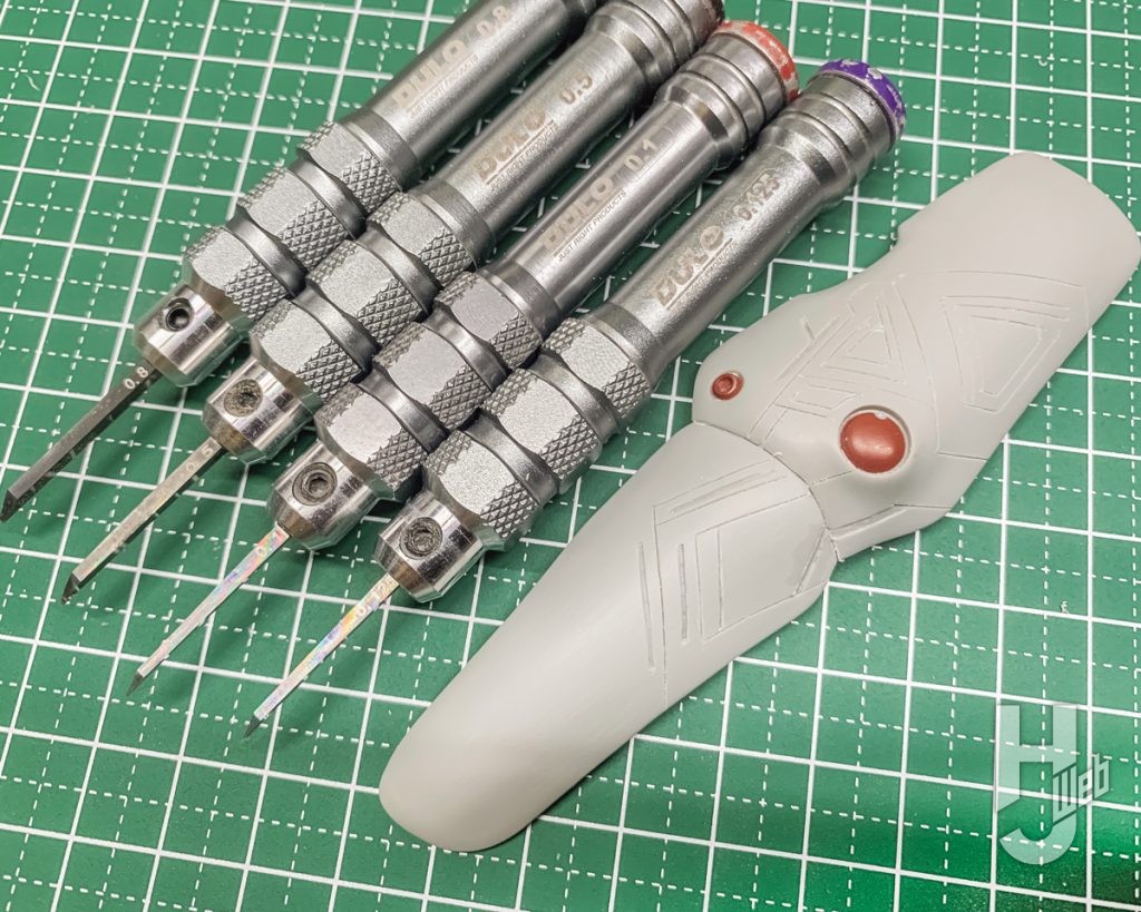 ▲長盾の紋様は、キット付属の水転写式デカールをガイドにタングステンブ レードやリューターで彫り込んで立体的な表現に。上腕のケーブルは1mm径 のアルミ線に熱収縮チューブを密着させたものに交換し、平手は補強用のリ ブを削り取っている