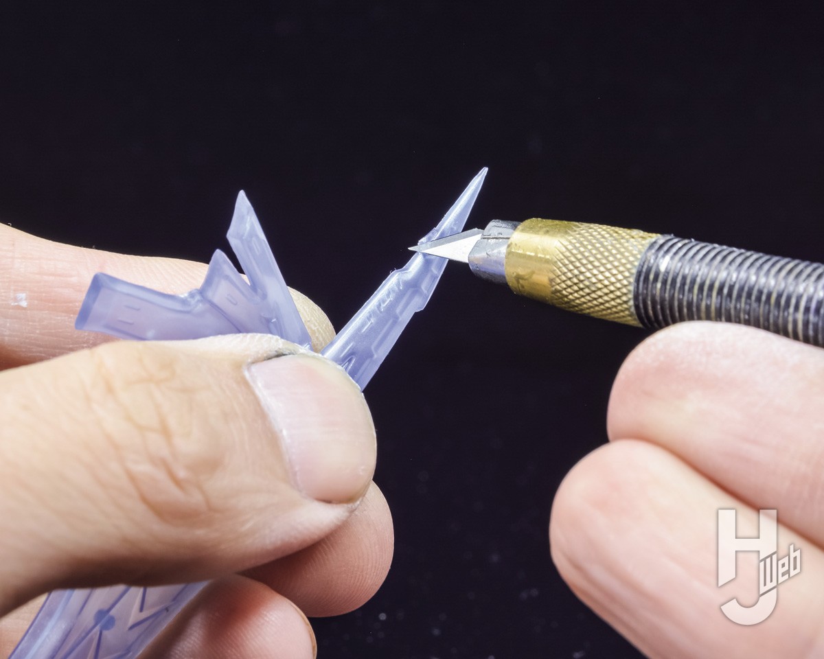 ▲ 残ったゲートをデザインナイフでカットします。一気に切ろうと力をかけると、ゲートの根元が白化したり割れたりしてしまうため、少しずつ、少しずつ、あくまでじっくりと丁寧に削り落としていきましょう