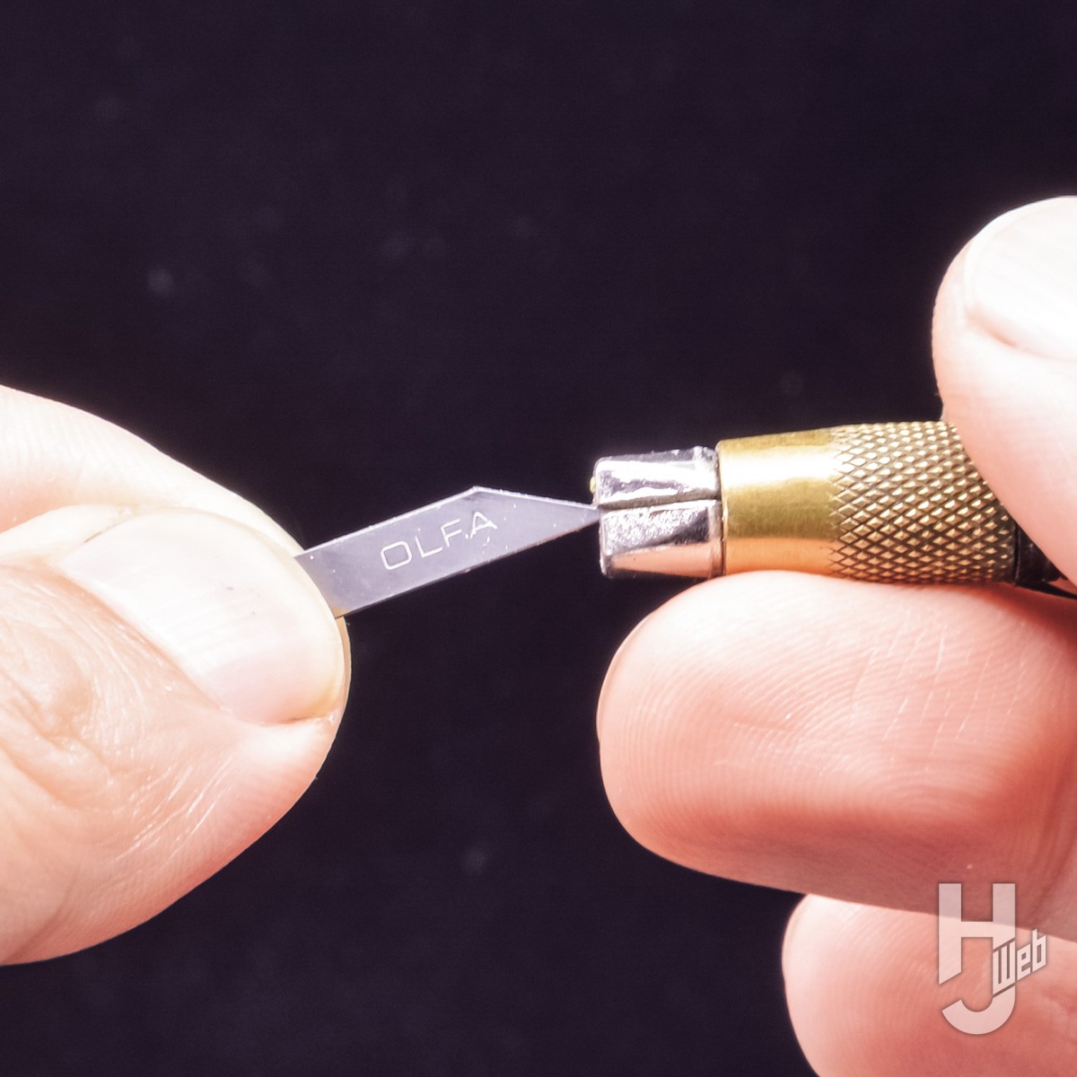 ▲ クリアーパーツは硬いため、ゲートカット中、デザインナイフの刃は急速に摩耗していきます。少しでも切れ味が鈍ったと感じたら、すぐに刃を交換しましょう。私は今回、タミヤの替え刃30枚セットをすべて使い切りました