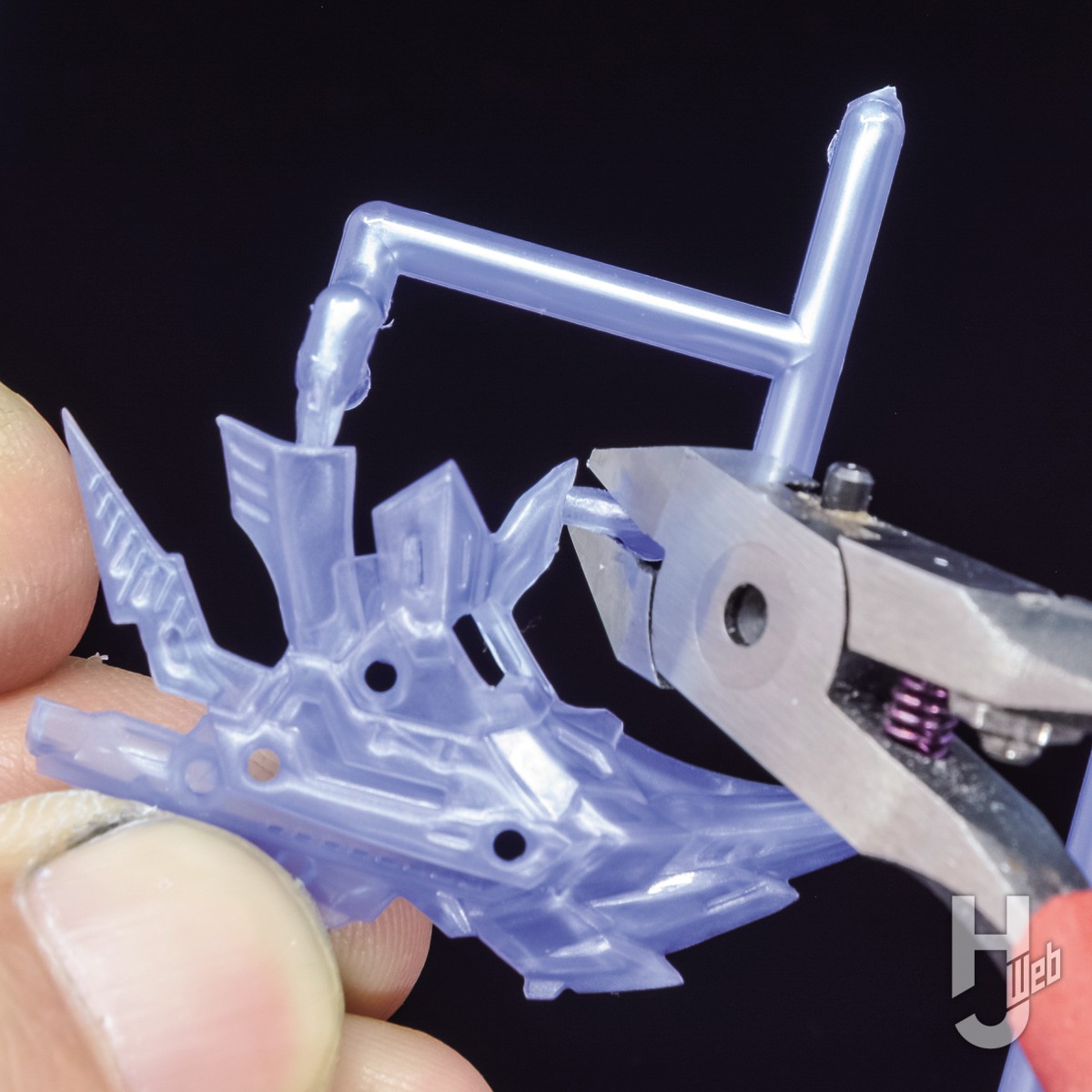 ▲ キットの外装はGTM特有の半透明装甲の再現のため、クリアーパーツで成型されています。クリアーパーツは硬く、ひび割れしやすいため、普通のプラモデルのようにニッパーの二度切りでパーツを切り離すとゲート跡が汚くなってしまいます。ここはクリアーパーツを美しく切り出す方法を学んでみましょう