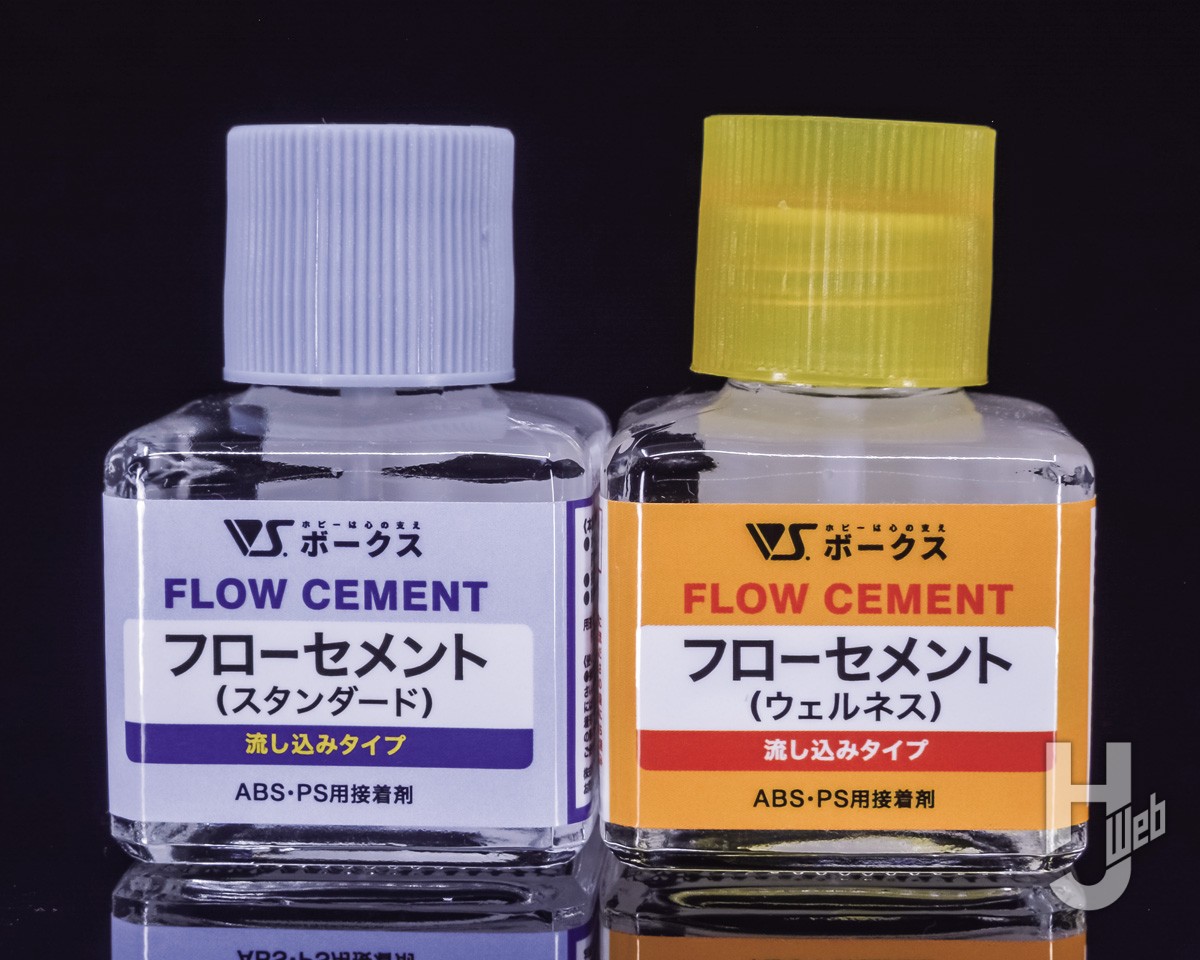 ▲ ボークスのGTM、MHキットはABSとプラのパーツが両方入っており、その2つを接着する部分も多々あります。ここはABS、プラ両方を接着可能な接着剤である、フローセメントを使いましょう。いずれも流し込みタイプで、通常成分のスタンダードと健康面に配慮したウェルネスの2種。お好みで選びましょう