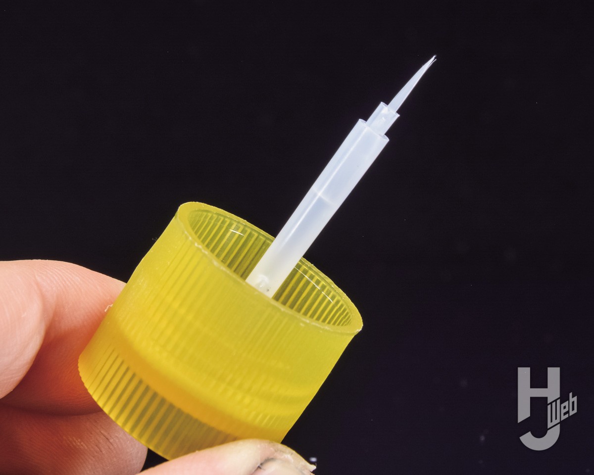 ▲ フローセメント最大の利点はこのハケ。これまでのプラキット用接着剤のハケよりも細く、長く、かつ弾力や強度が高いため、接着剤をピンポイントで必要な場所に塗ることができるのです。繊細な接着が必要になるGTMの製作において、これがあるかないかで難易度が大きく変わってくるほどです