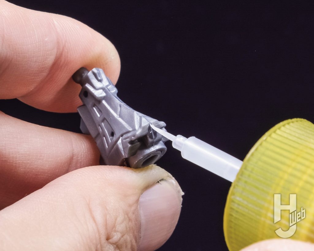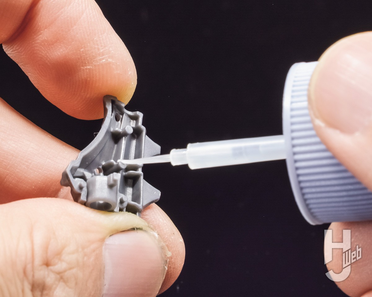 ▲ 今回は合わせ目を消さず、組み立てるだけの簡単仕上げですので、できる限り接着剤がはみ出ないようにキレイに組み立ててみましょう。まず、基本はピンの部分のみに通常タイプのフローセメントを塗ります。パーツの接合面に接着剤が付着しないため、汚くなるリスクなく組み立てることができます
