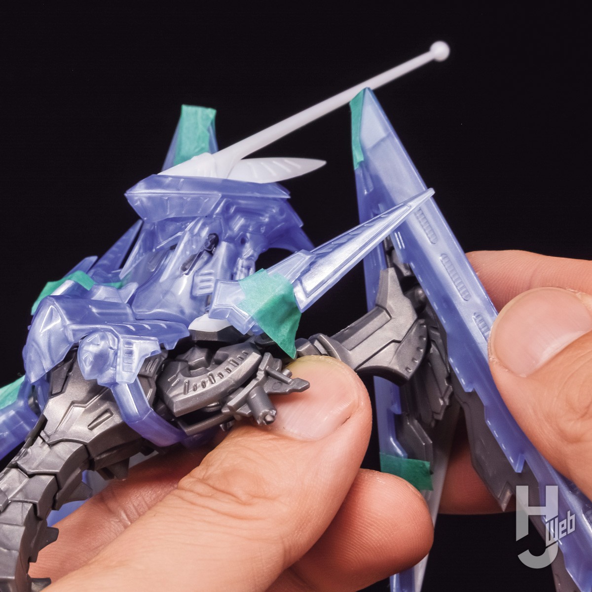 ▲ キットの関節部は、独特のプロポーションとバランスを保つGTMを自立させるため、かなり硬めに調整されています。はめ込むときに力をかけすぎ、クリアーパーツを割ってしまわないように注意してください