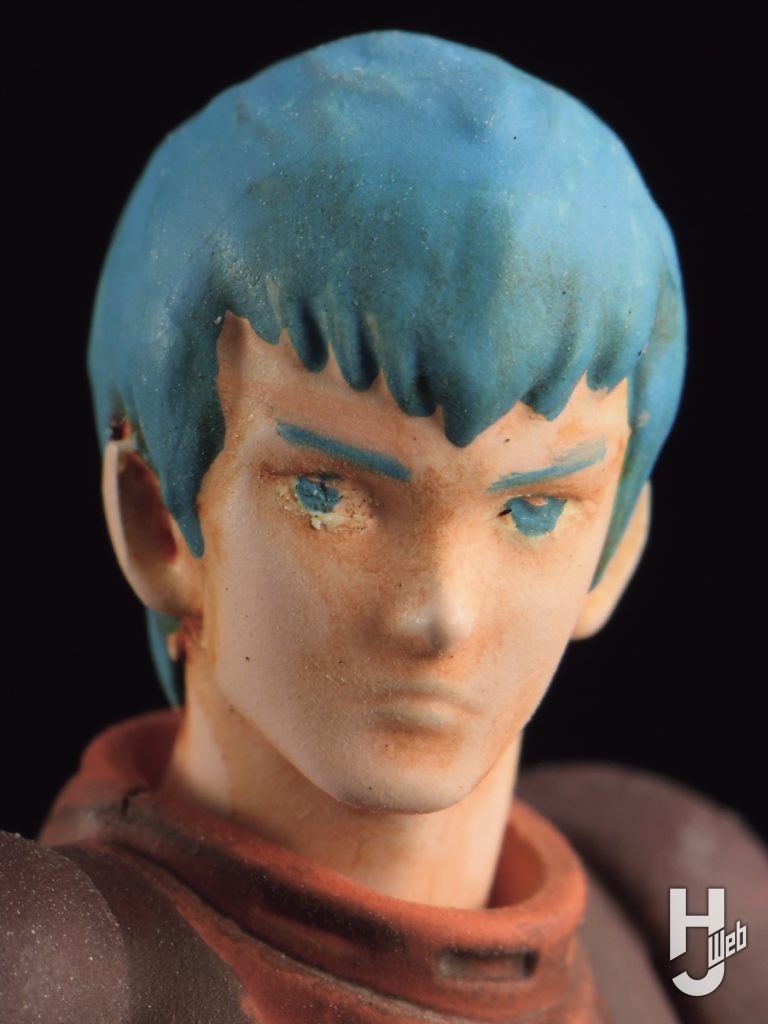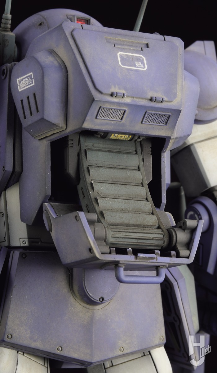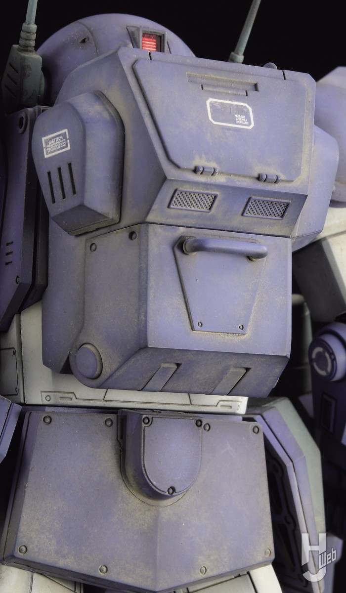 塗装は完成見本よりも赤味を加え、紫よりの青を基調として塗っています。問題はウェザリングです。劇中のラビドリードッグは“下ろしたて”のATのため、