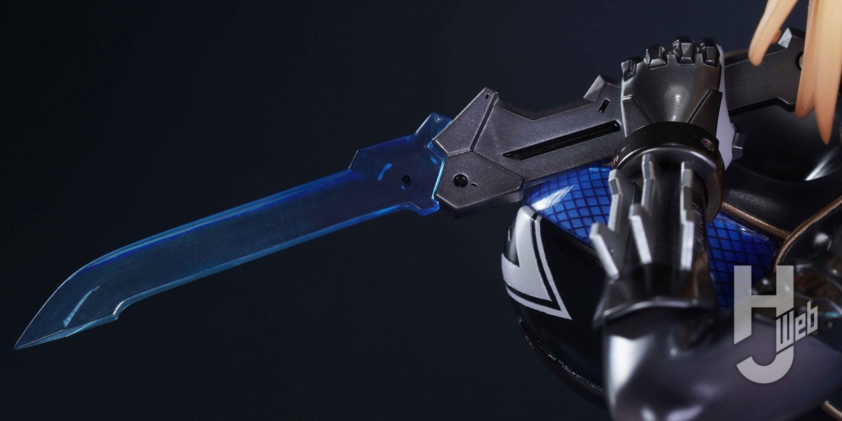 ▲左手差し替えパーツで小刀を構えたポージングも楽しめる。武装や衣装など随所にクリアー素材を使用したことでサイバーな雰囲気をバッチリと演出している