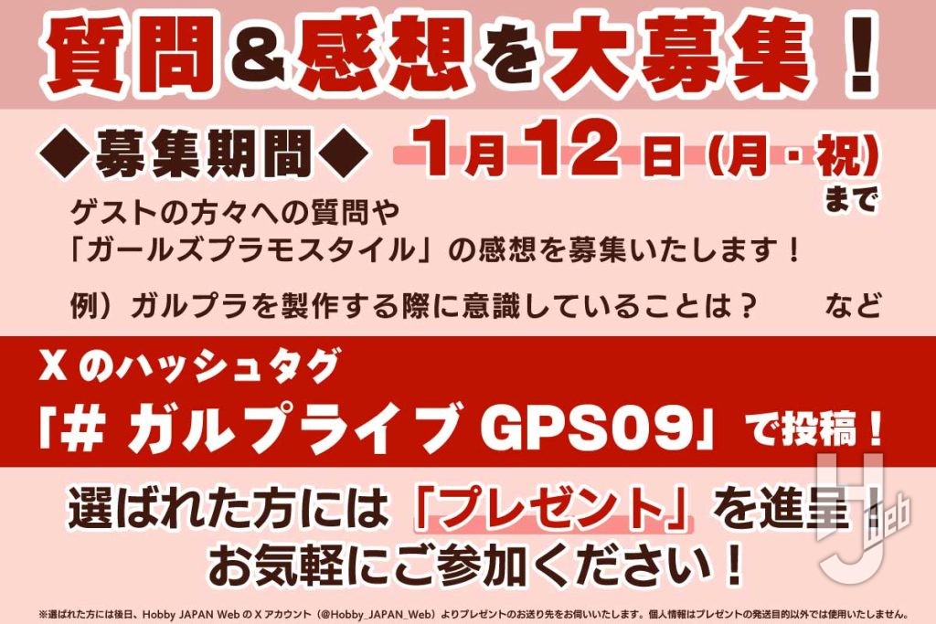 Xで事前にゲストへの質問やガールズプラモスタイルについての感想を、1月12日(月・祝)まで募集! Xでハッシュタグ「#ガルプライブGPS09」をつけて投稿することで、参加することが可能。選ばれた方には、プレゼントも進呈! ぜひお気軽に参加していただきたい。