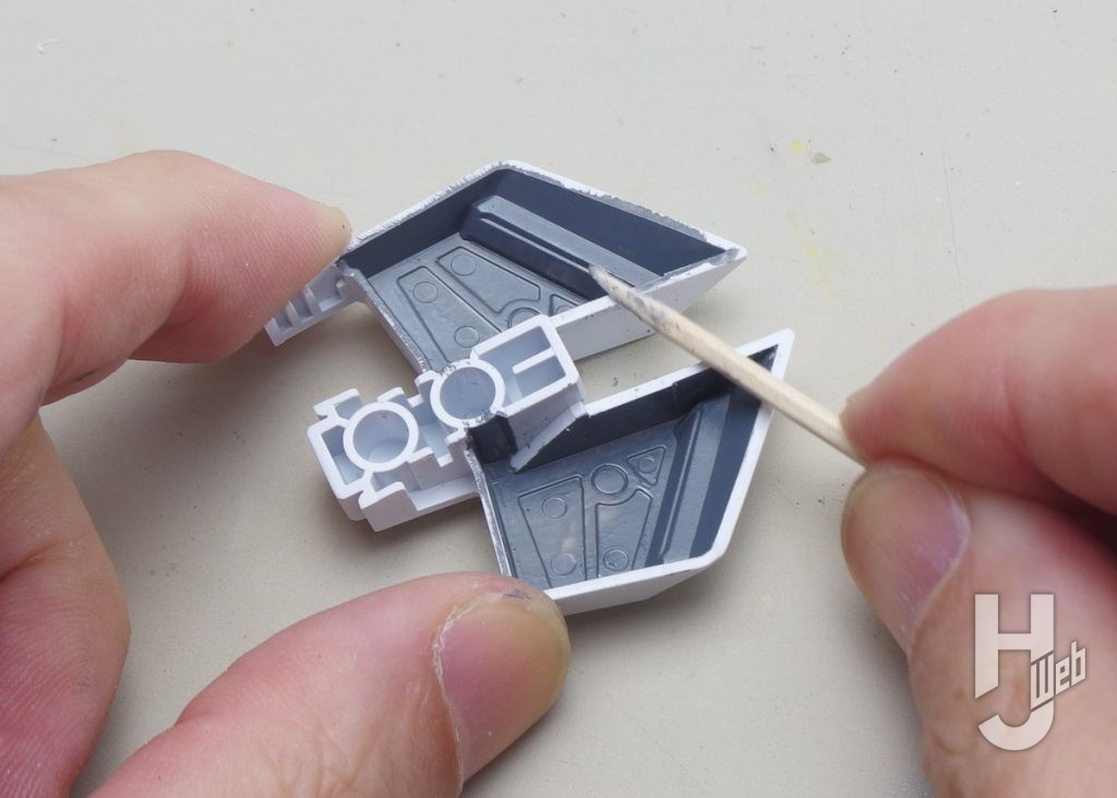 ▲腰の後面のアーマー。凹んだ裏面をグレーに着色。パーツのフチとそこからつながる面を白く残しています