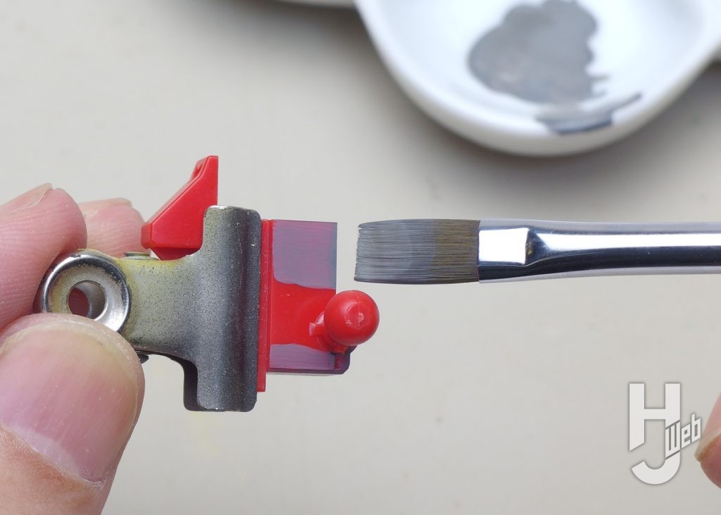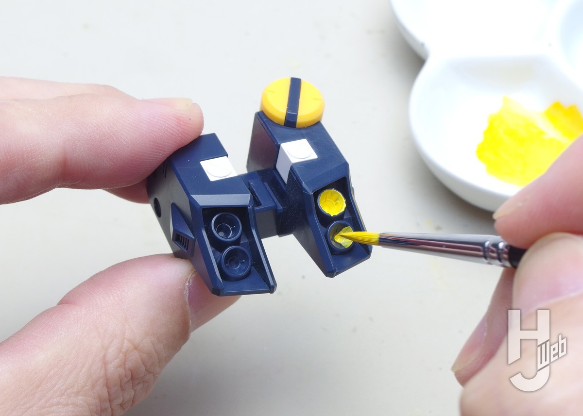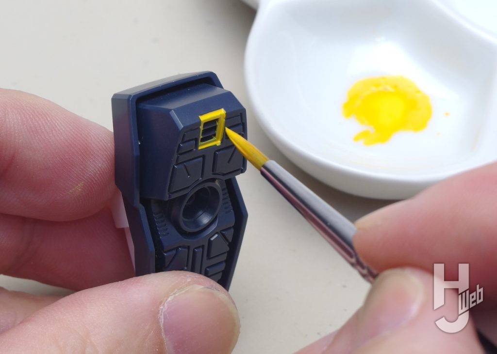 続いては細部の着色。ムネのセンサー部を細筆で塗ります。