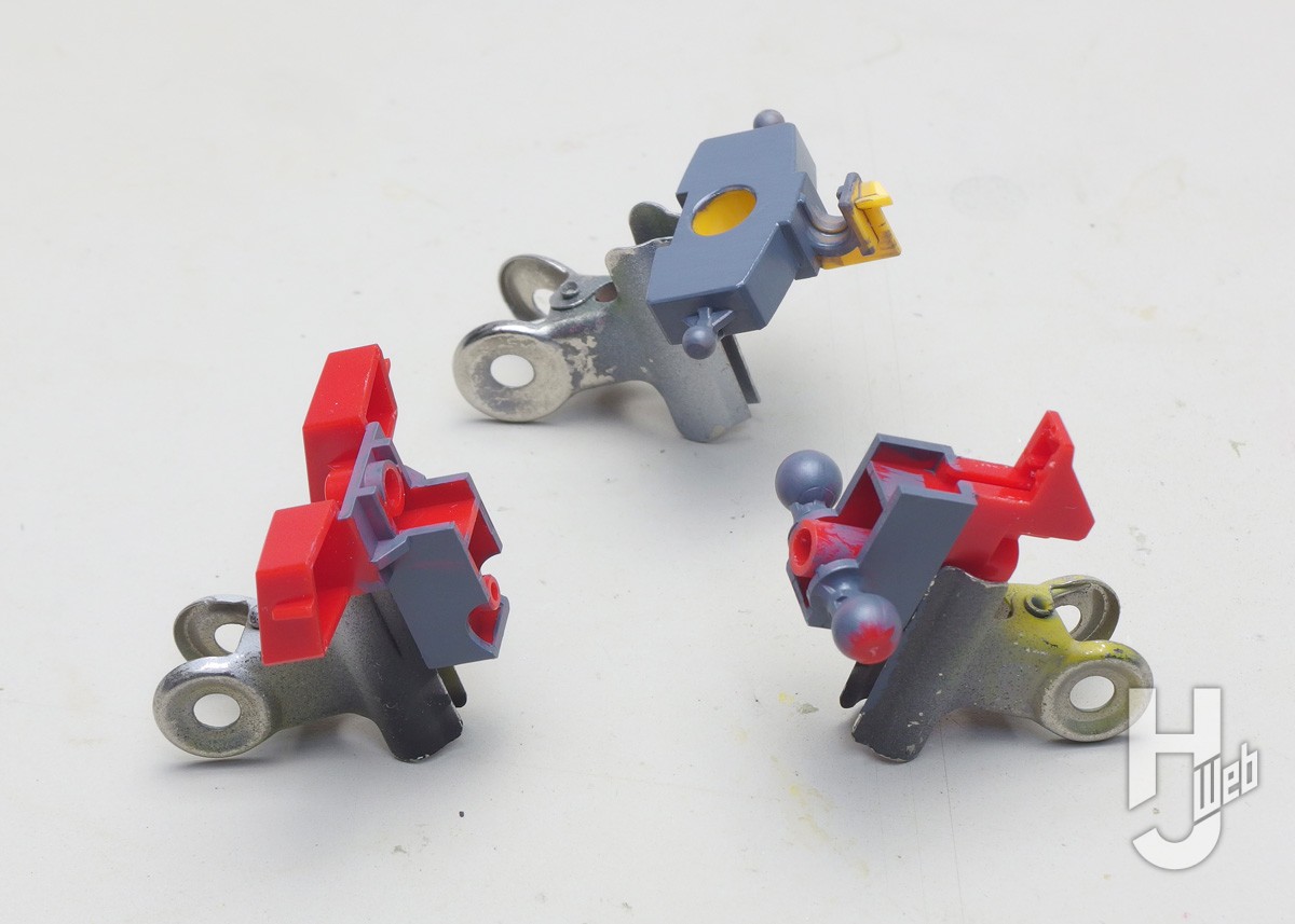 ▲股間節のブロック。前後にイエロー、レッドが見える部分を残して中心部をグレーに塗ります。各パーツに分け、持ちやすいようにクリップで支えて作業しています。持ち手は乾くまで触らずに浮かせておくためでもあります