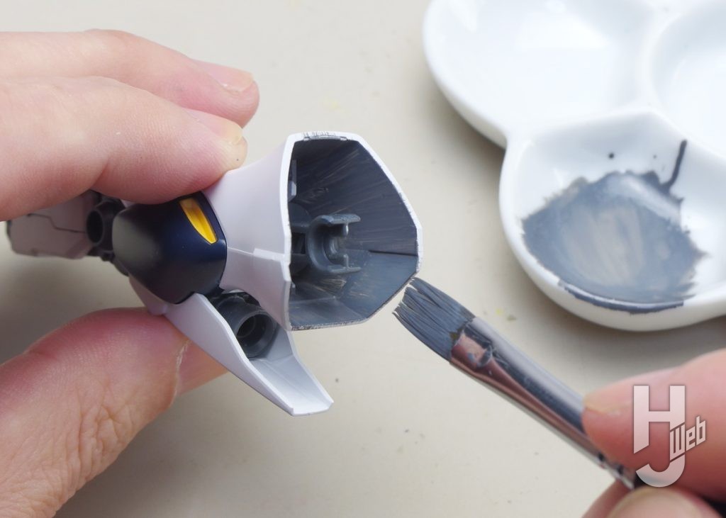 ▲バックパックと一体になったノズルの内側を塗ります。ノズルの底に塗料が溜まらないように、中心から外へ筆を運びつつ塗っていきます