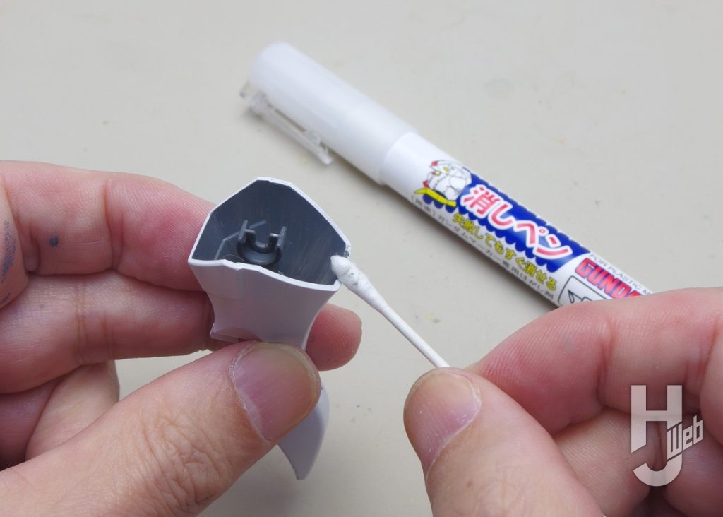 ▲周囲のハミ出しをツマヨウジ先で擦り取ります。機体各部の凹みやパネルラインにも同様にスミ入れをしています。こうしたマーカーペンでのスミ入れについては過去回を参考にしてくださいスミ入れを学ぶならこちらの記事を確認