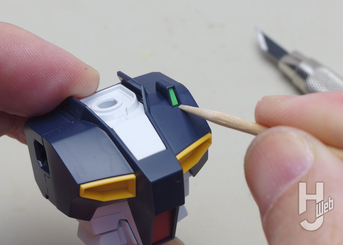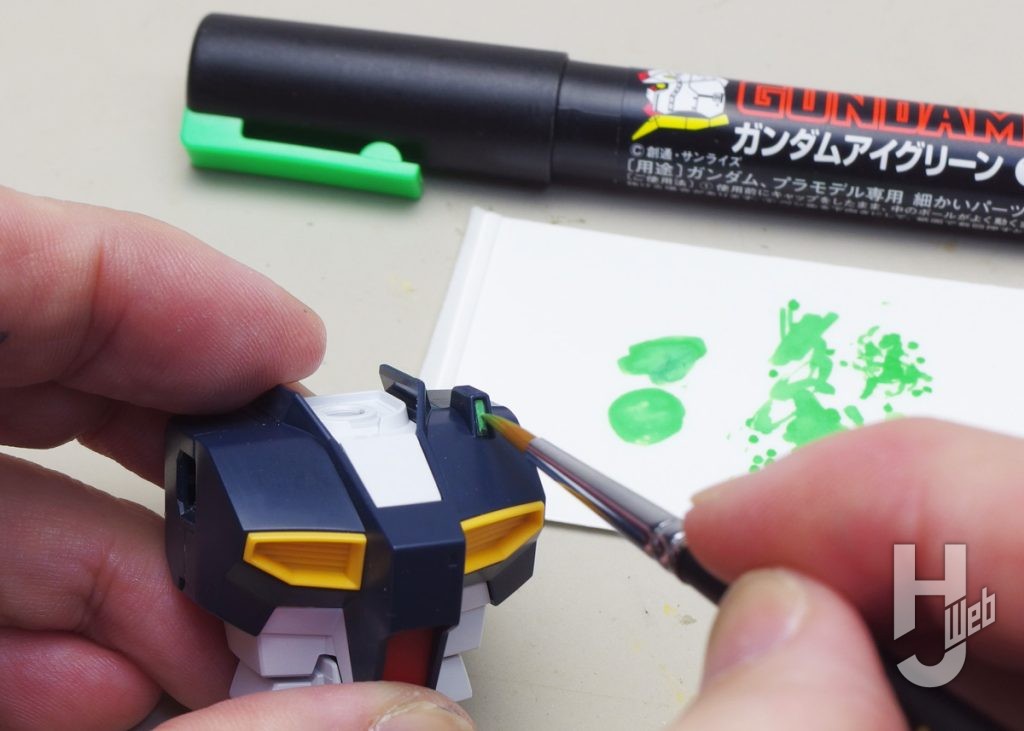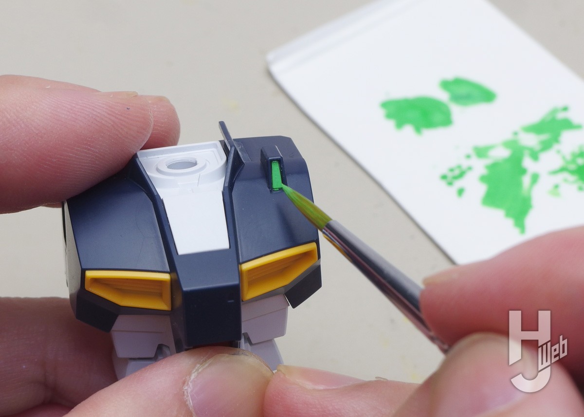 ▲ガンダムアイグリーンでセンサー面を塗ります。マーカーは少量使うだけなのでパレットに出しています。試し塗りで細筆での塗り具合を確かめてからパーツ面に塗っていきます。パーツ色が濃いので最初はやや発色が弱いです