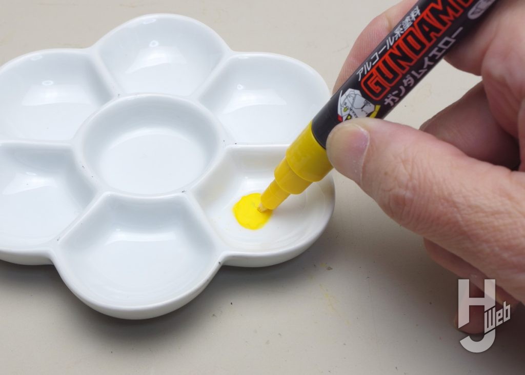 ▲ガンダムイエローを皿に出します。これを筆で扱うのはグレーでの塗装と同様です
