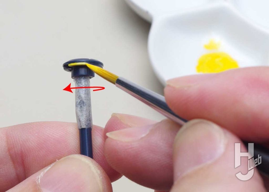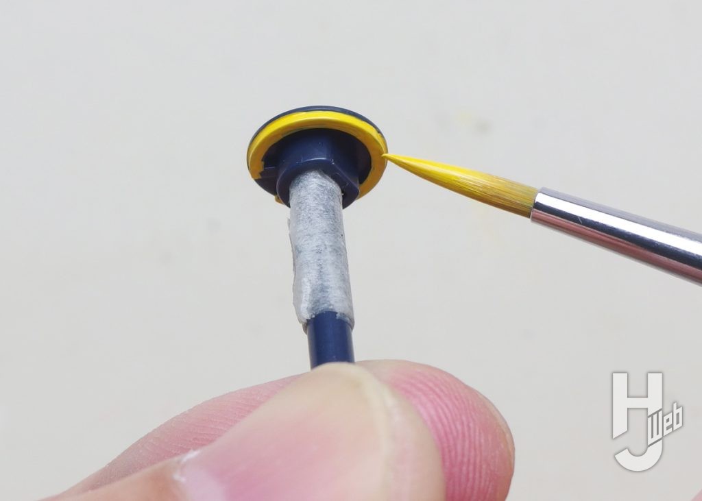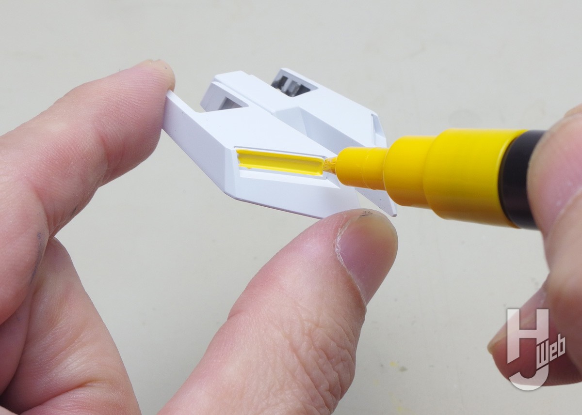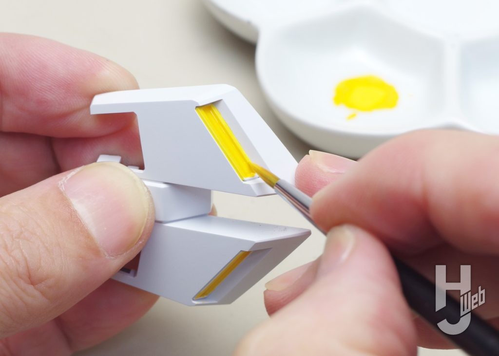 背面やバックパック、ノズル類をイエローで塗り足します。塗る箇所のカタチによって、仕上がりがよくなるように工夫もします。