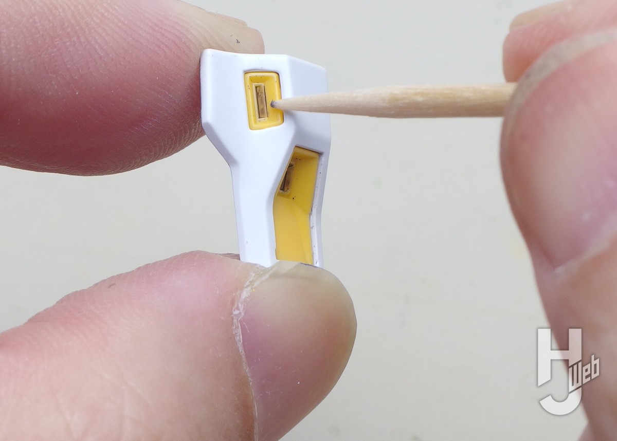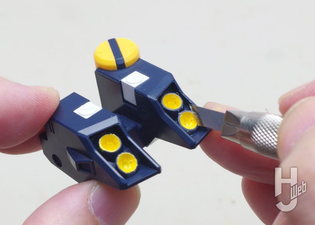 ▲ノズル周囲にはワクなどがありツマヨウジではハミ出しを擦りにくいので、ここでは45度の刃をつけたデザインナイフでフチを削いで修正しています。パーツ面が少し曇りますがシャープに揃います。周囲にキズを付けないように注意します