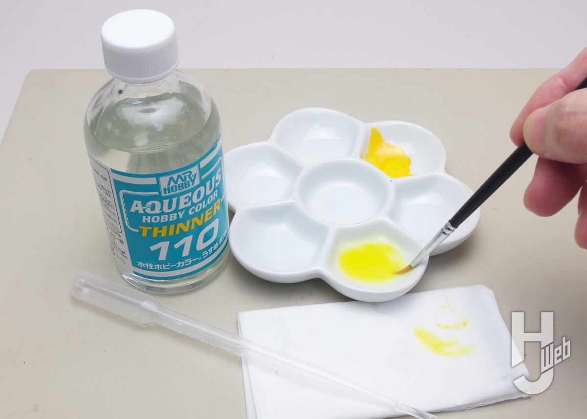 ▲各色を塗るごとに筆の塗料を洗い落とします。水性ホビーカラーのうすめ液を使っています