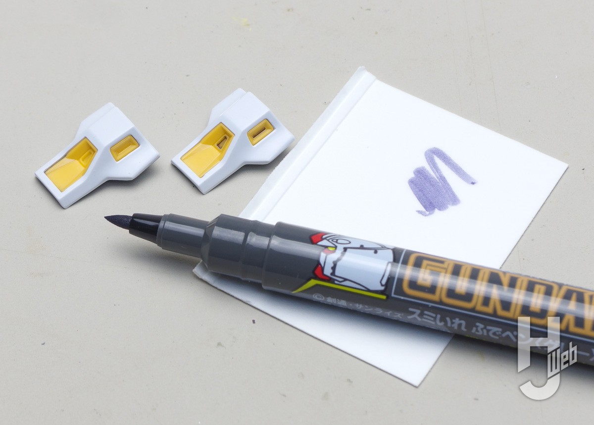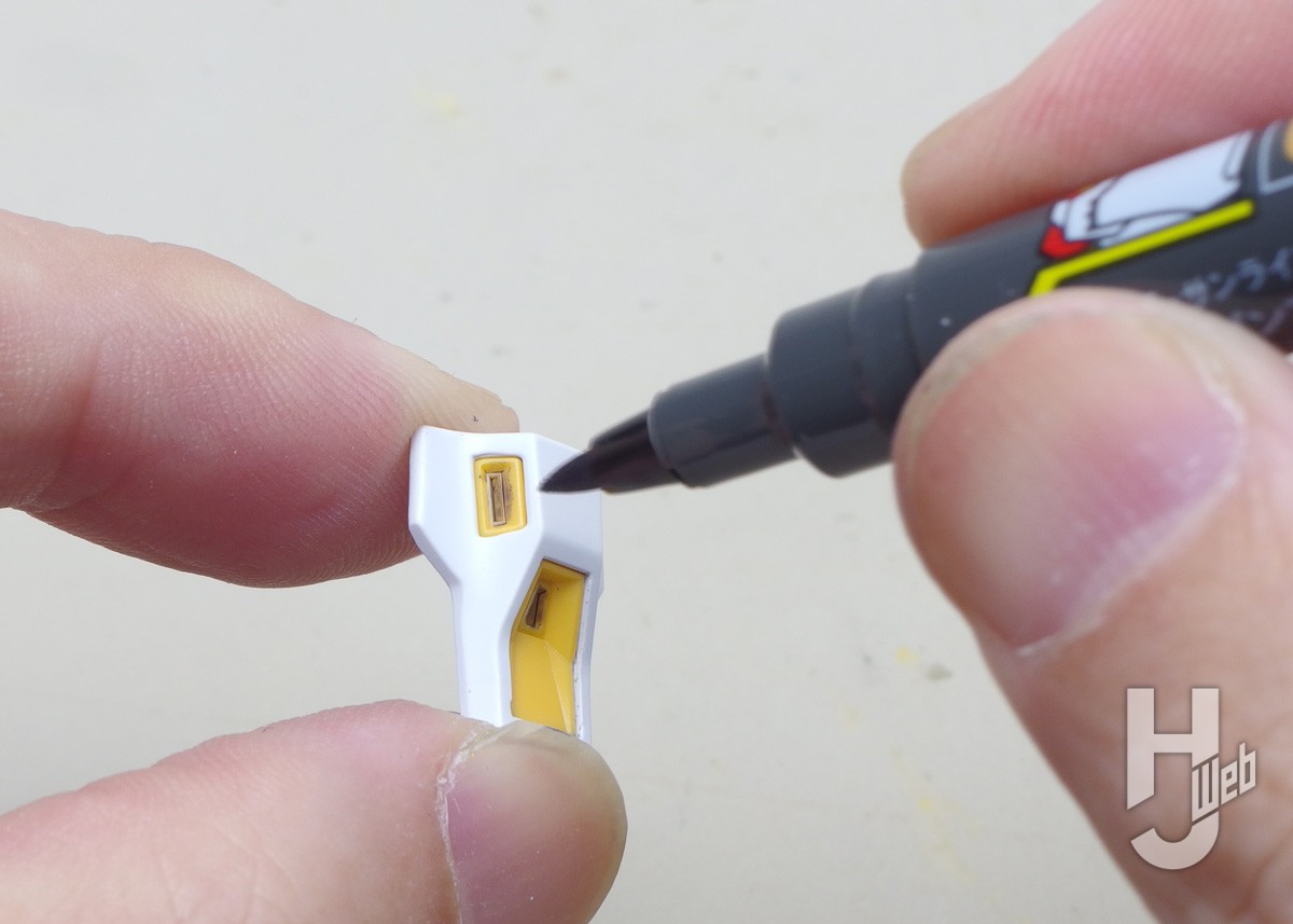▲腰アーマーのノズル面。真っ直ぐな面はマーカーのペン先くらいの幅なので、直接マーカーで塗ってみました。塗り分けの端まではインクを付けないようにしています