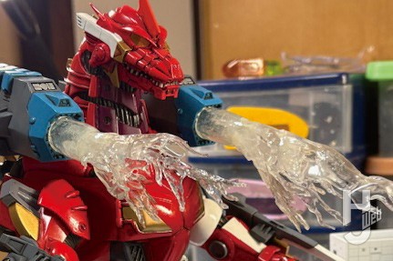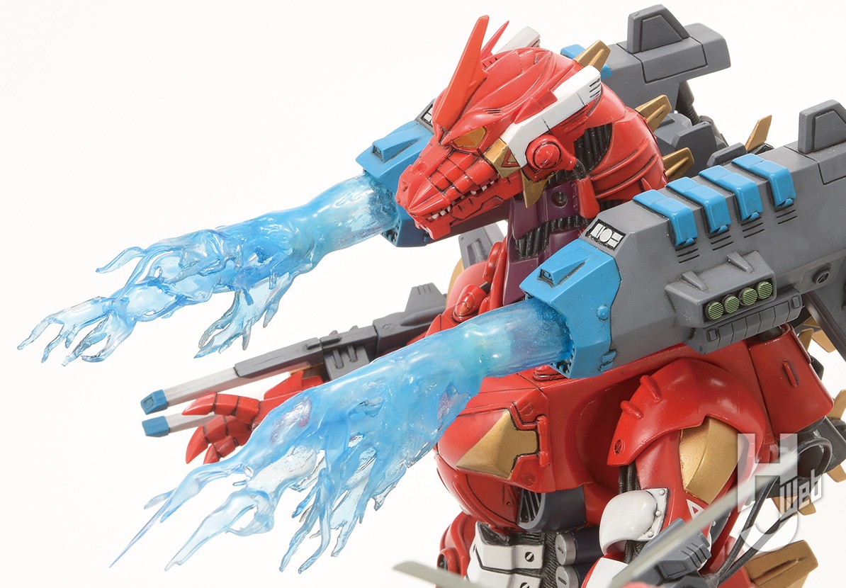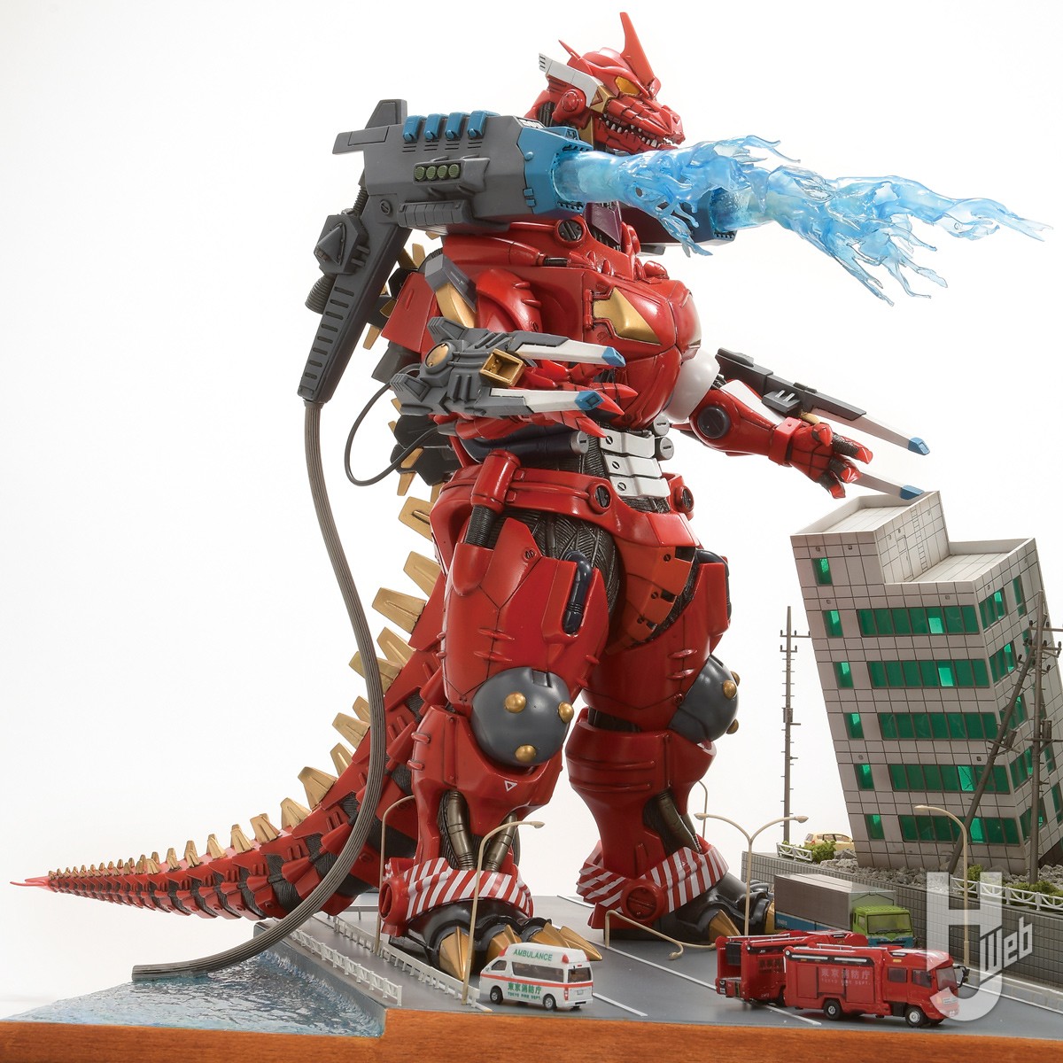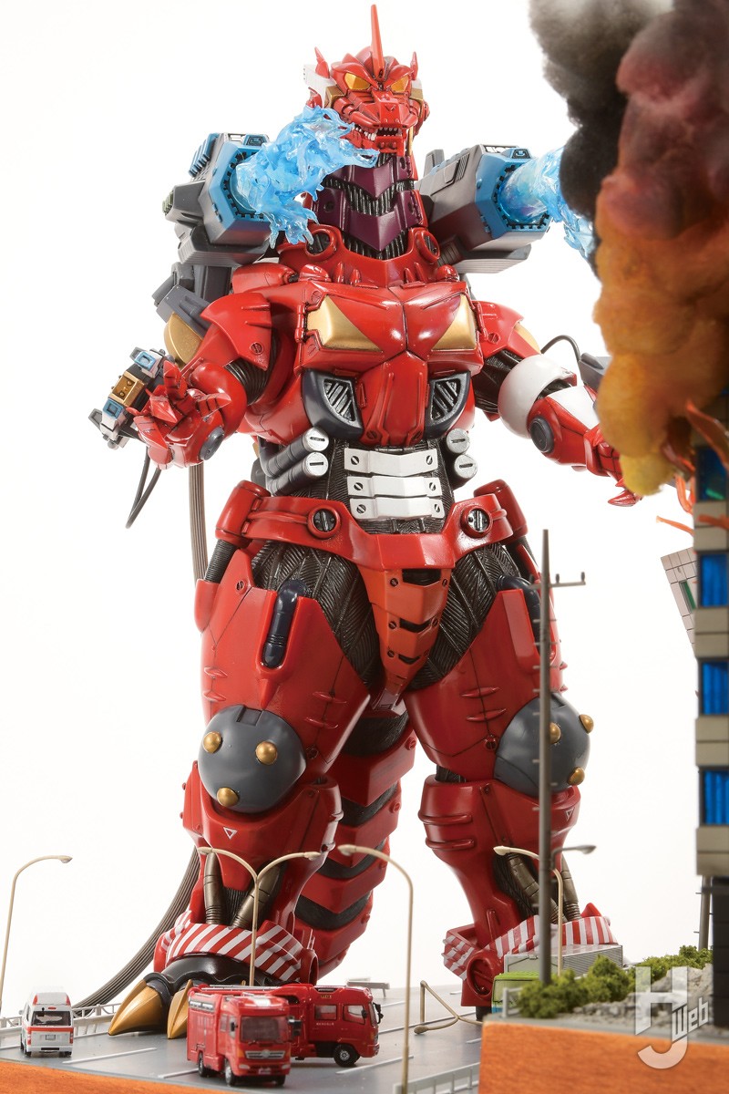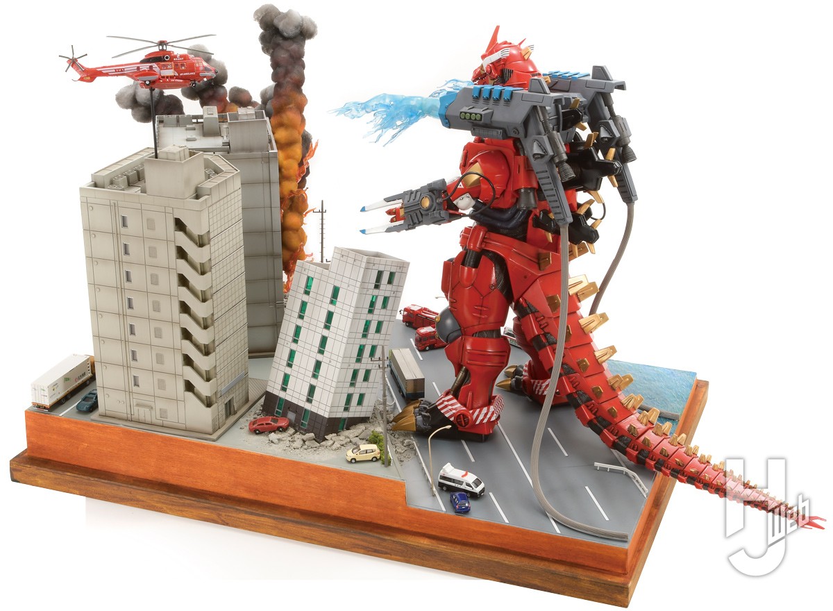 使用したアイテムは「エクスプラス東宝30cmシリーズ3式機龍(2003版)重武装型エヴァ2号機イメージカラー」。このモデルをベースにリペイントを施して消防バージョンに仕立て上げました。バックパックからは大量の消化放水を行っているように、放水をアクリル板で再現しました。