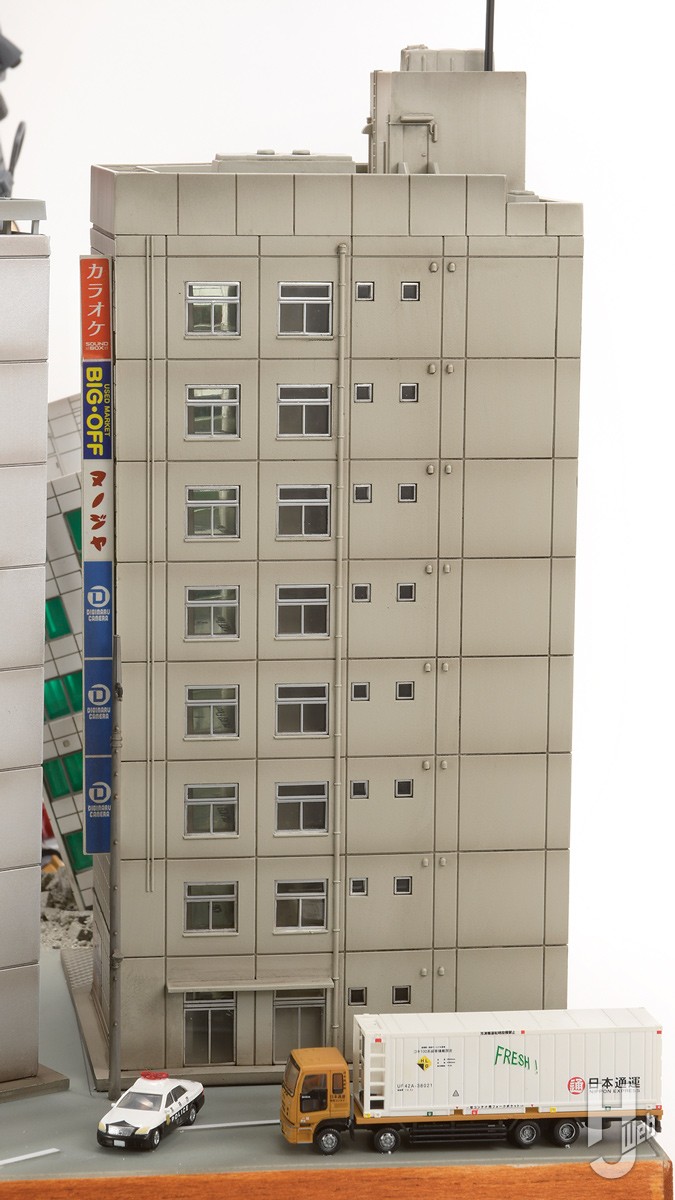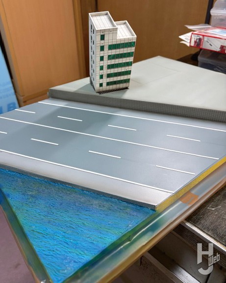 ベースは木製パネルにスタイロフォームを貼り付けて基本的なレイアウトを決めます。さらにプラ板を貼り付けて、これをアスファルトにします。ビルは鉄道模型のストラクチャーからチョイス。火災の炎と煙はアクリル板と綿で表現。ガレキは石膏を薄く伸ばして乾燥後、細かく砕いてばら撒いてあります。川は石粉粘土プルミエを使用して再現。消防車両やヘリコプターなどは、1/150スケールのストラクチャーを使用しました。