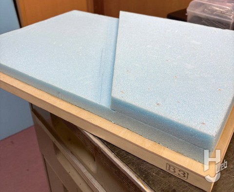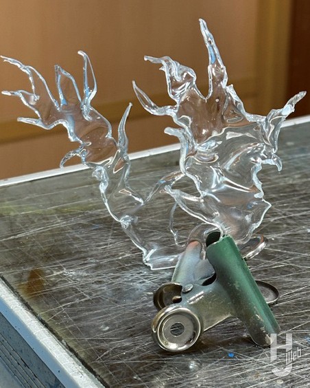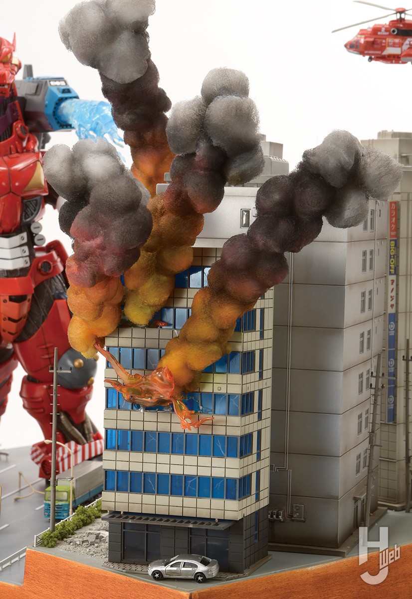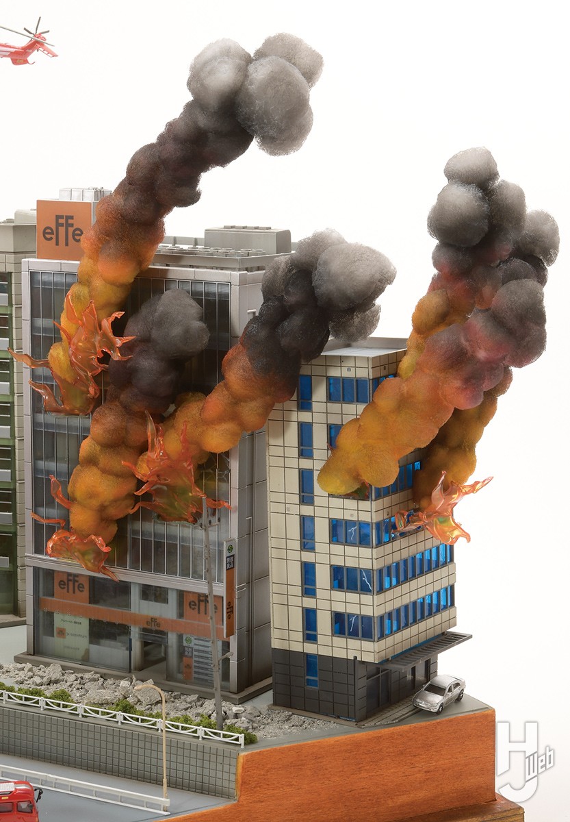▲火災の炎と煙はアクリル板と綿で表現。ガレキは石膏を薄く伸ばして乾燥させたあと、細かく砕いて、木工用ボンドを水で溶いた水溶液で固着させている
