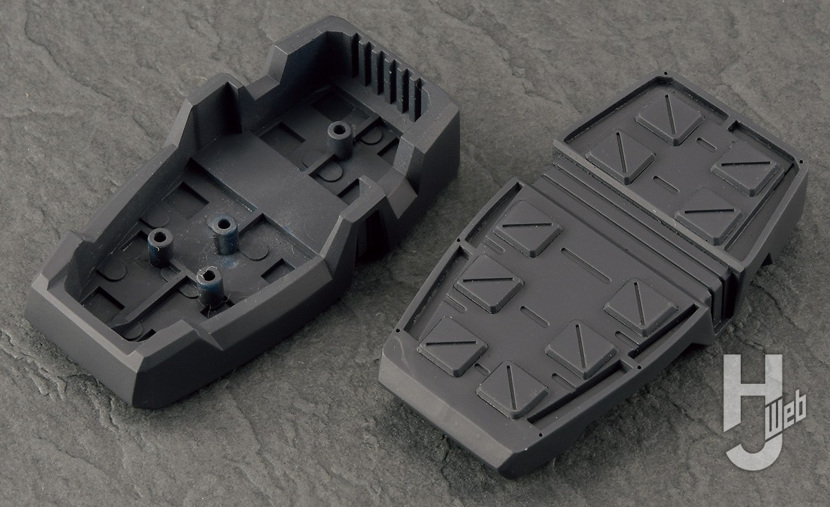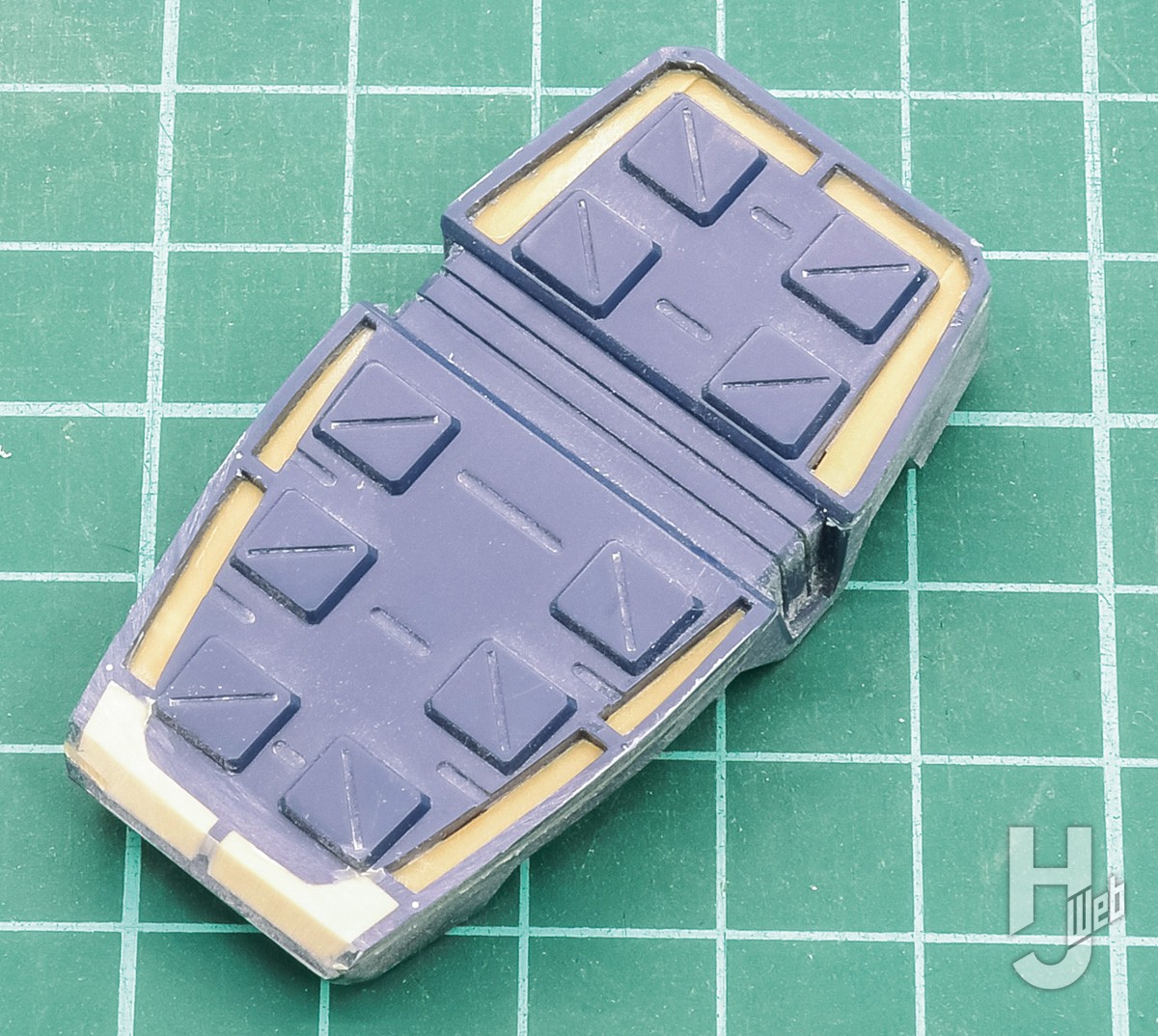 ▲裏側の肉抜きは、つま先はエポパテで埋めて、他は側面にレザーソーで切れ込みを入れてから0.3㎜プラ板を差し込んでふさいだ