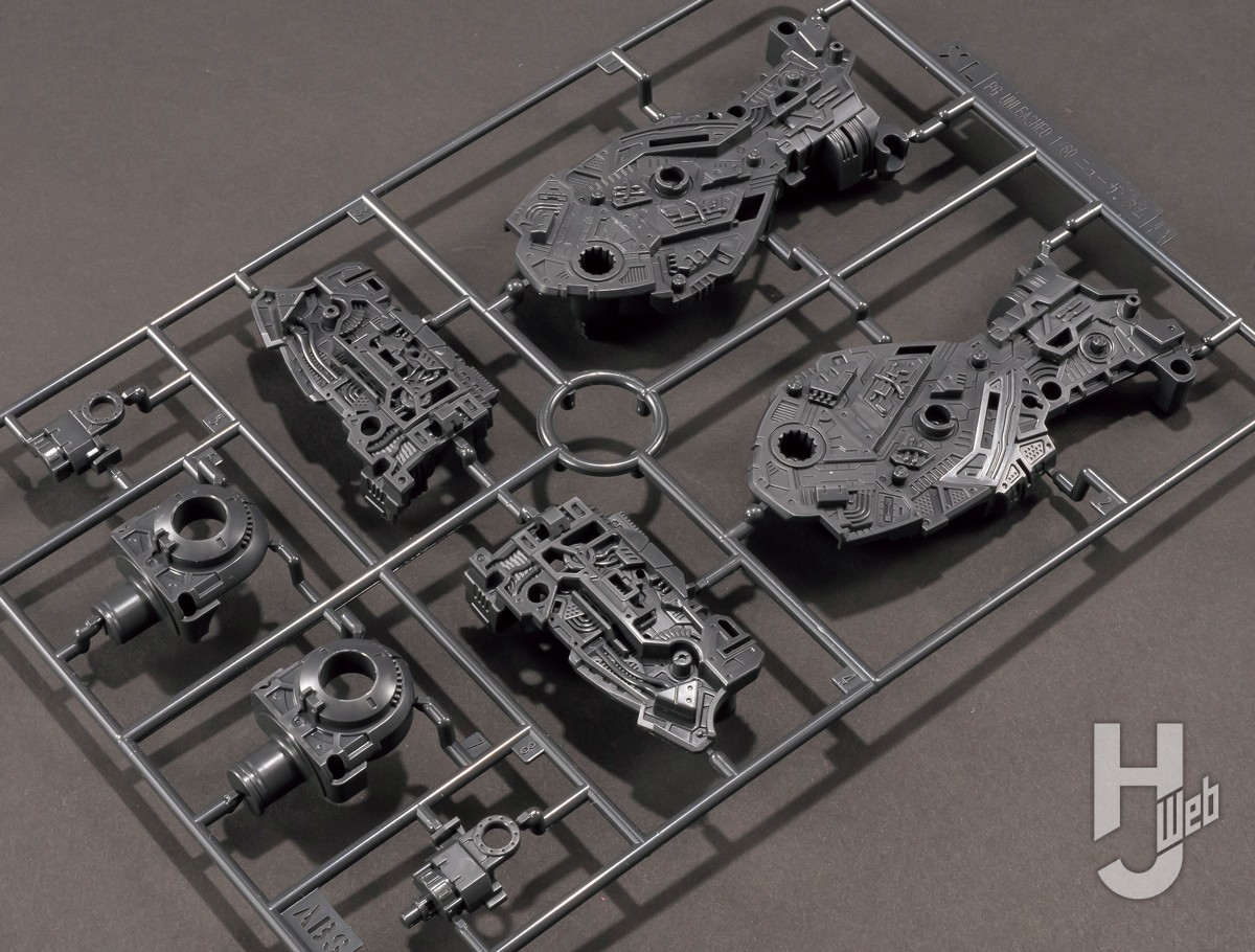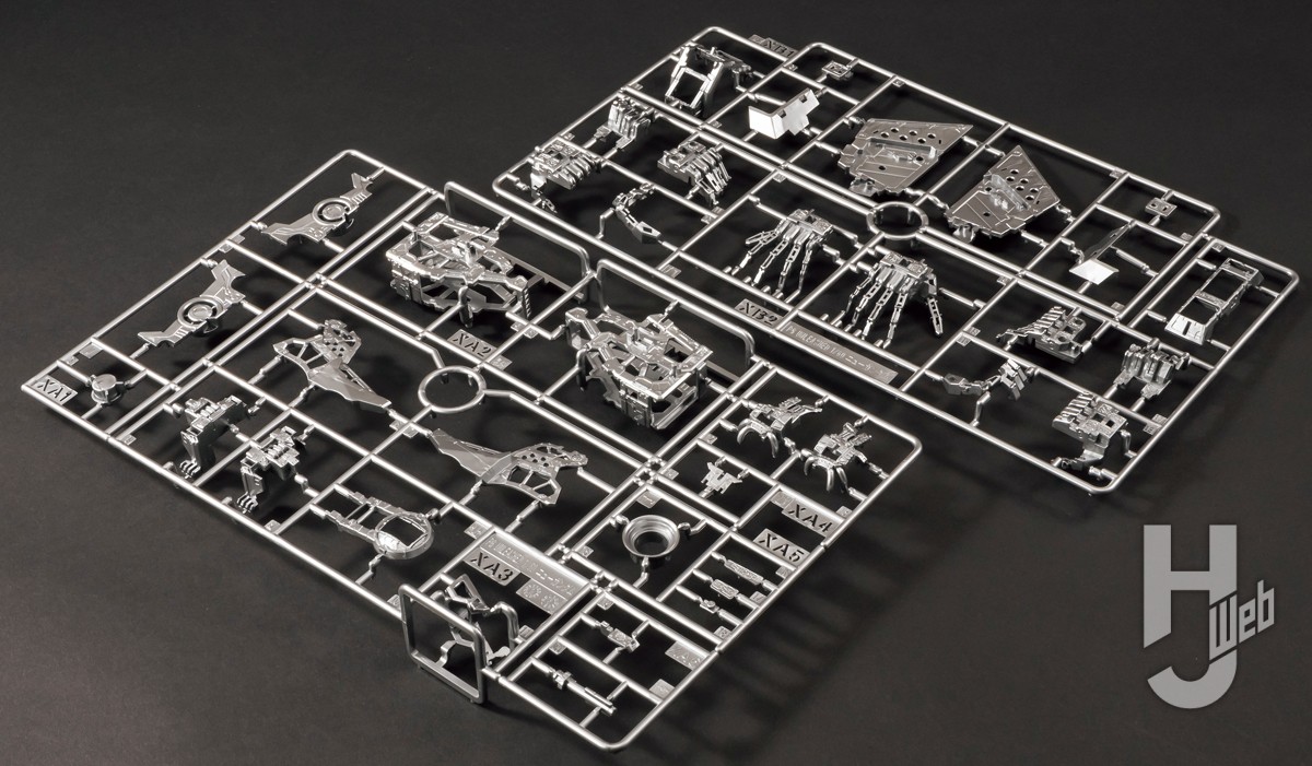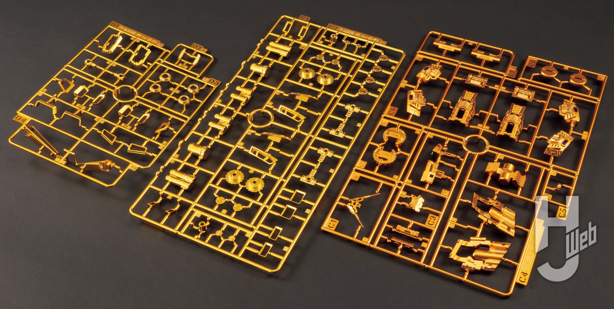 ▲フレームのトラス構造や内部メカモールドの一部にメタリック成型パーツを使用。シルバーは成型色で、ゴールドはメッキ加工(ゴールドとオレンジゴールドの2色)を採用している