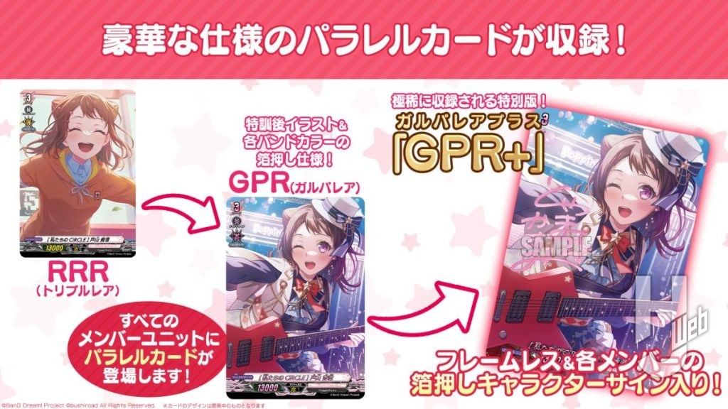 こちらは9周年を迎えるアプリ「バンドリ! ガールズバンドパーティ!」とコラボした豪華仕様のブースターで、すべてのメンバーユニットにパラレルカードが登場。さらにフレームレス、各メンバーの箔押しキャラクターサインが入った「GPR+(ガルパレアプラス)」も極稀に収録されます