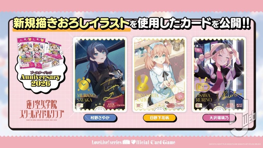 2月28日(土)発売予定の「ブースターパック Anniversary 2026」に収録される新規描きおろしイラストが初公開! 今回公開されたのはAqours・蓮ノ空のカードで、Aqoursから高海千歌・桜内梨子・渡辺 曜の3人が、蓮ノ空からは日野下花帆・村野さやか・大沢瑠璃乃の3人がそれぞれ収録!