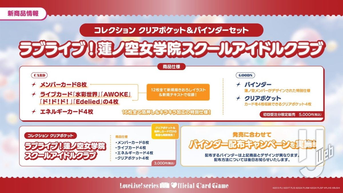 さらに同じく5月に「コレクション クリアポケット ラブライブ!蓮ノ空女学院スクールアイドルクラブ」の発売も決定! 集めたカードを収納できるクリアポケットに加え、新規描きおろしイラストを使用した16枚のカードがセットになっている超お得なアイテムだ。また、クリアポケットを収録できるバインダーが付属した「コレクション クリアポケット&バインダーセット ラブライブ!蓮ノ空女学院スクールアイドルクラブ」も同時発売予定で、発売に合わせたキャンペーンも企画されているので要チェックだ!