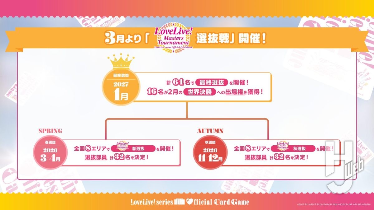 3月~4月に掛けては全国8エリアにて「春選抜2026」が開催。8エリアで合計32名の選抜部員を決定し、同じく秋ごろ実施予定の「秋選抜2026」を勝ち上がった選抜部員とあわせて「最終選抜」を実施。最終選抜で上位の成績を収めたプレイヤーは、「店舗予選ーエリア予選」のルートを経由せずに「LoveLive! Masters Tournament」世界決勝に出場できるとのこと。