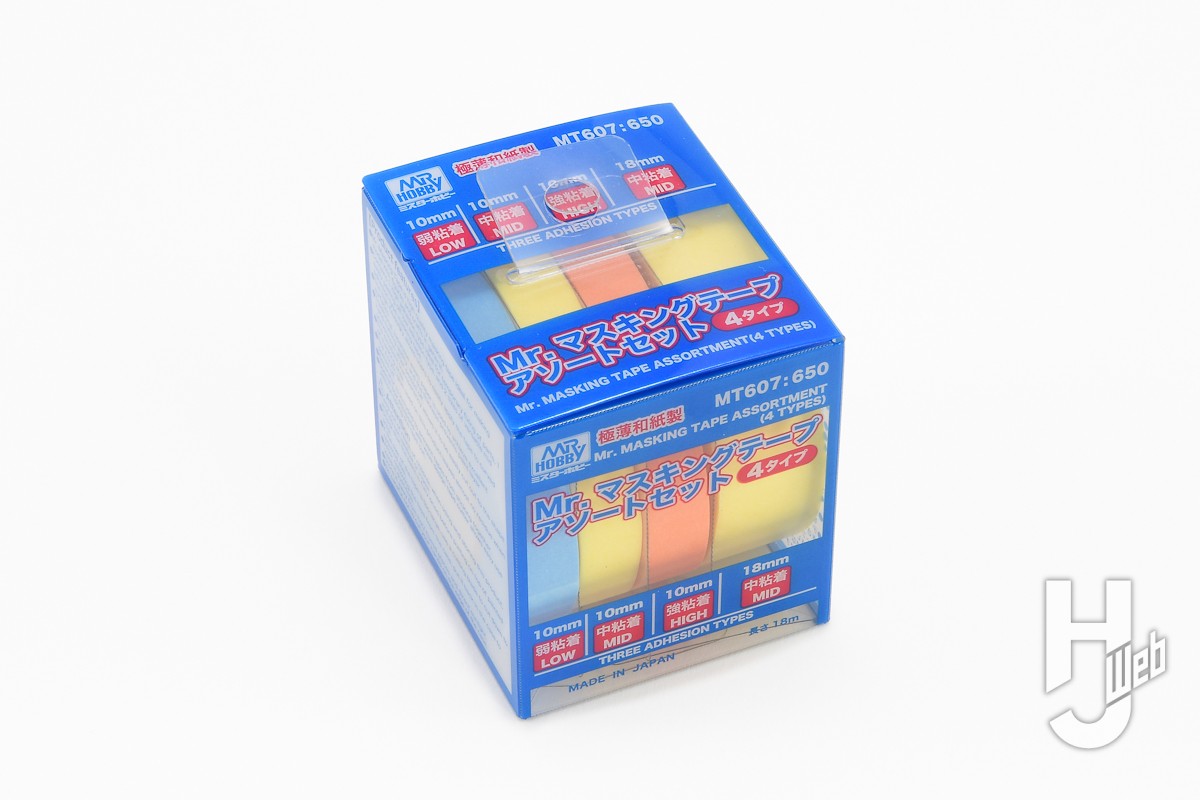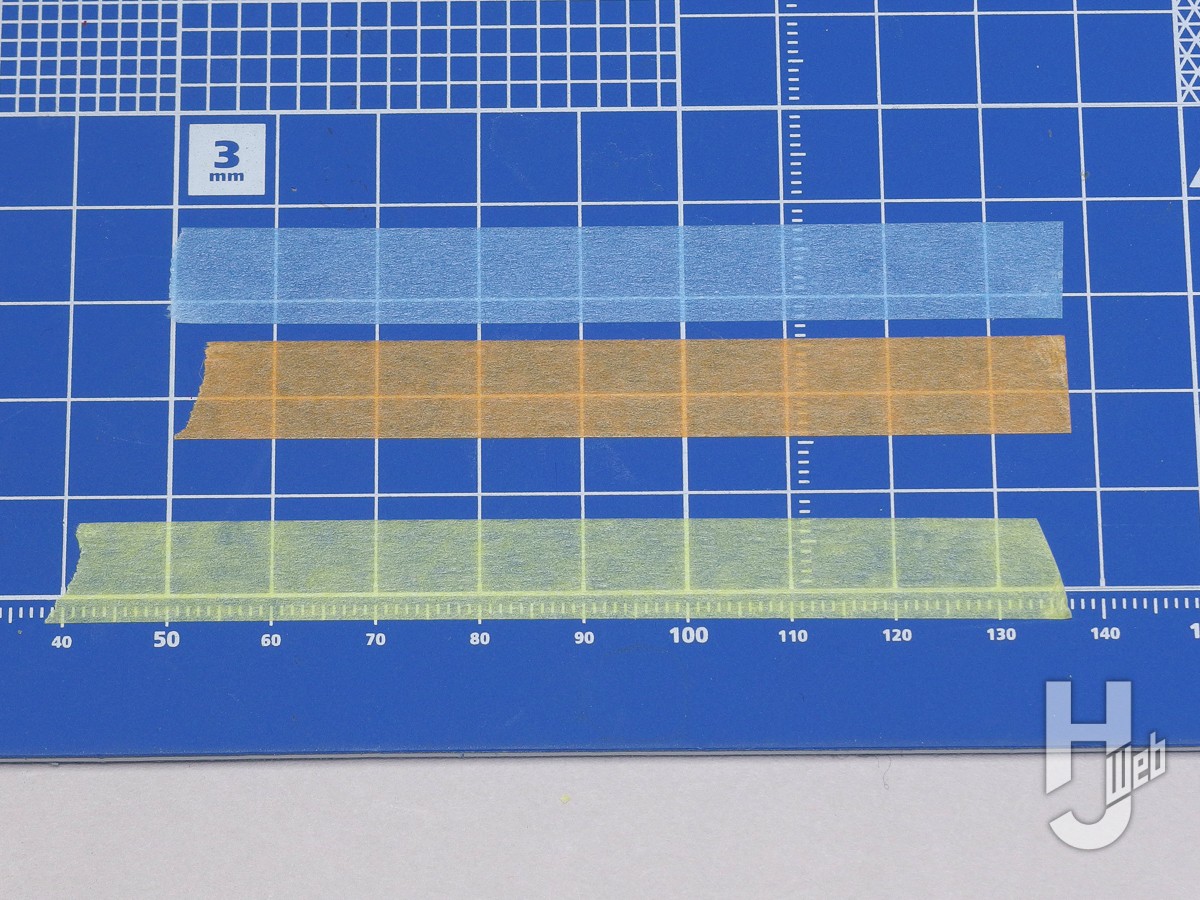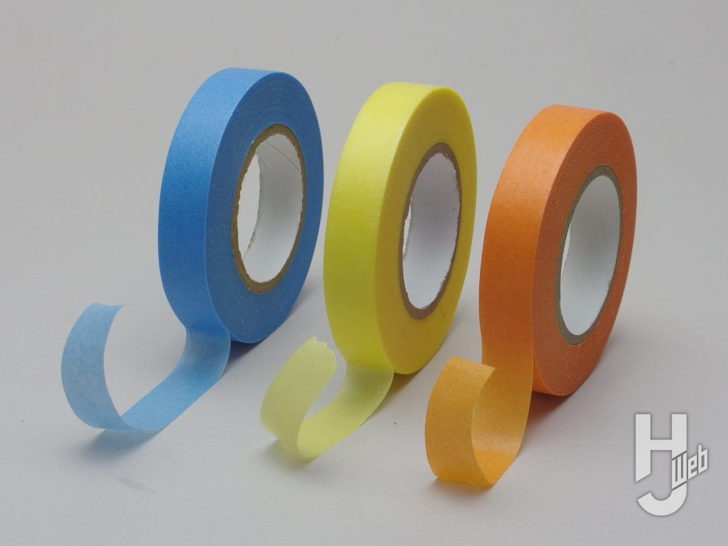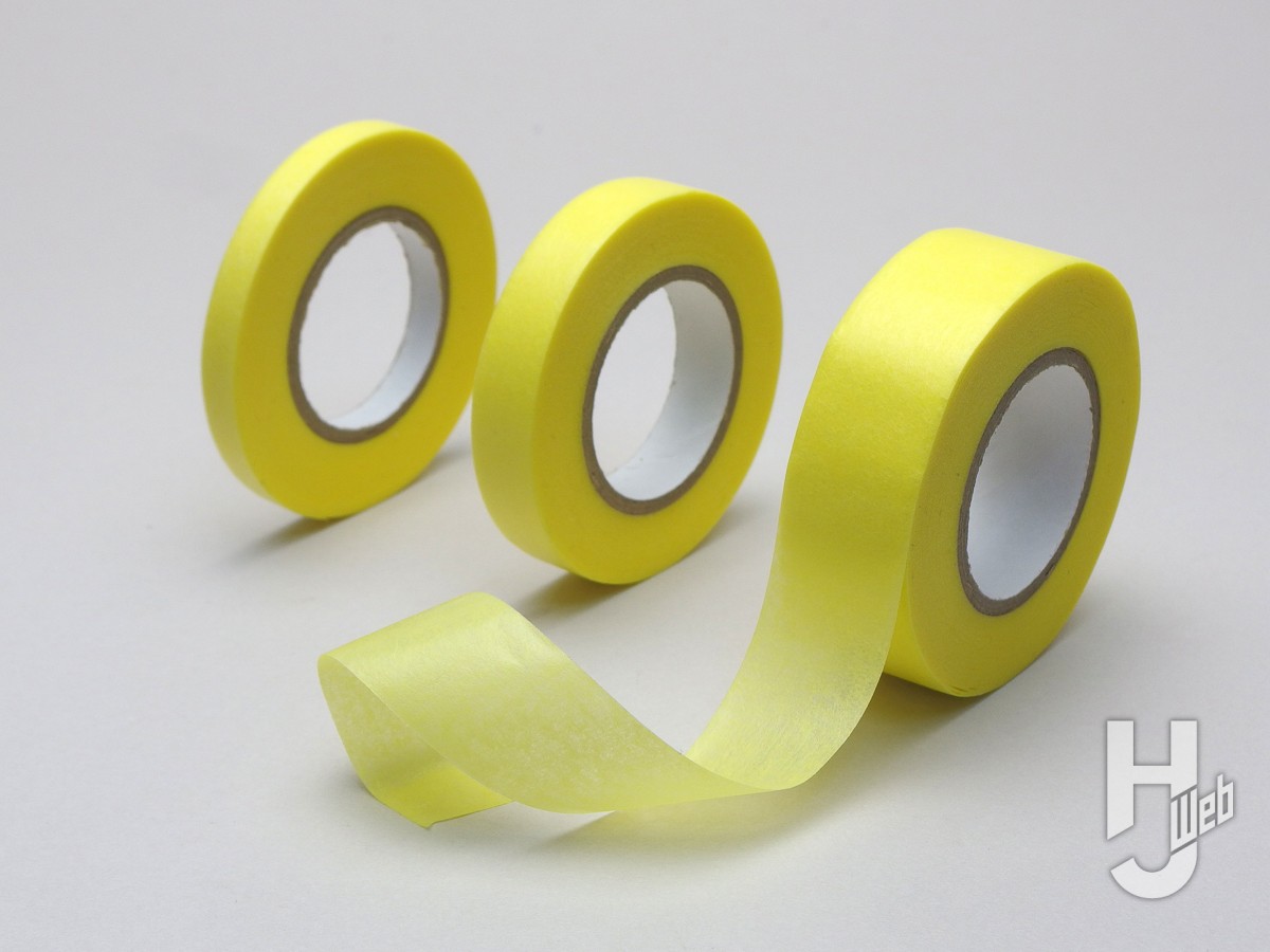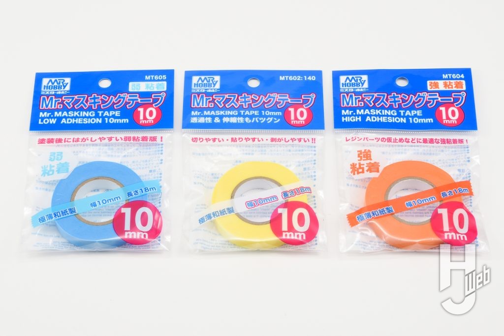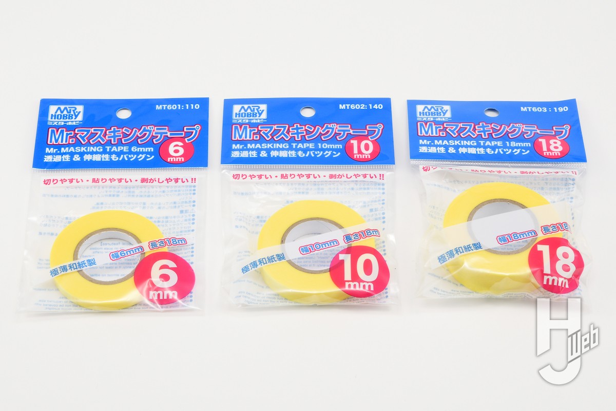 ▲Mr.マスキングテープの通常版で、幅は6、10、18mm。極薄の和紙が基材でノリは剥がしても残らないアクリルのりが使われています