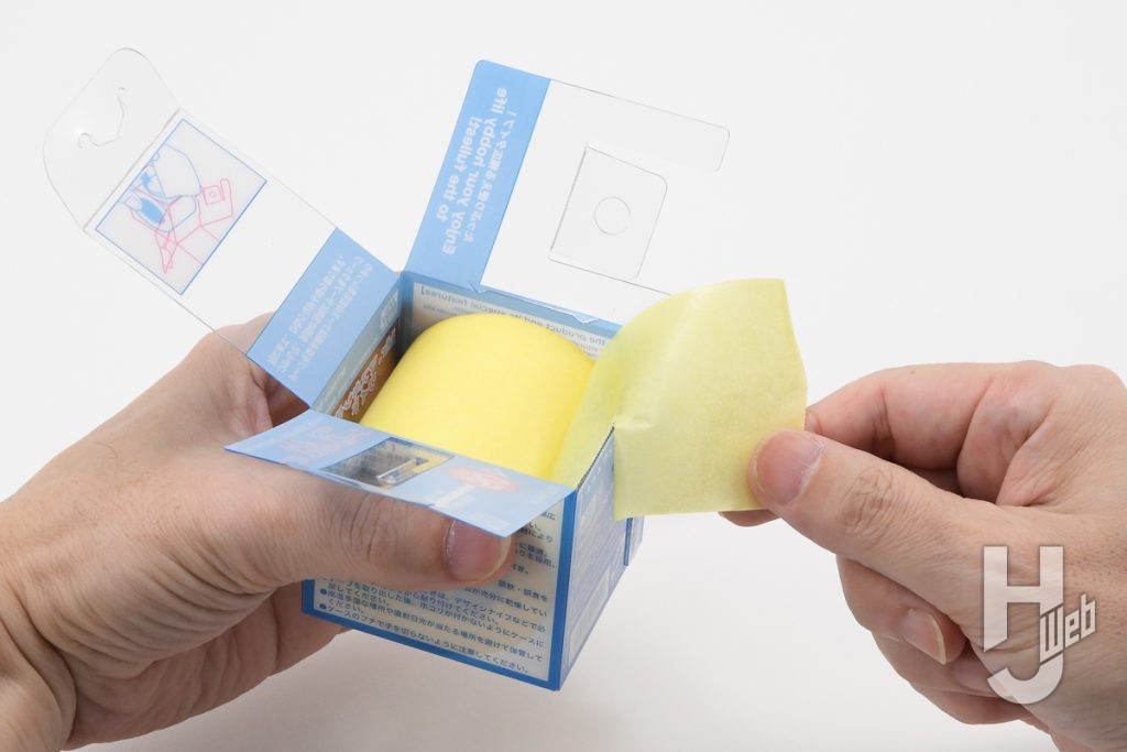 ▲ボックス型のPET製ケース入りで保管しやすくホコリの付着も防ぎやすい。開口部のフチが波型で簡単にテープカットができるのも便利