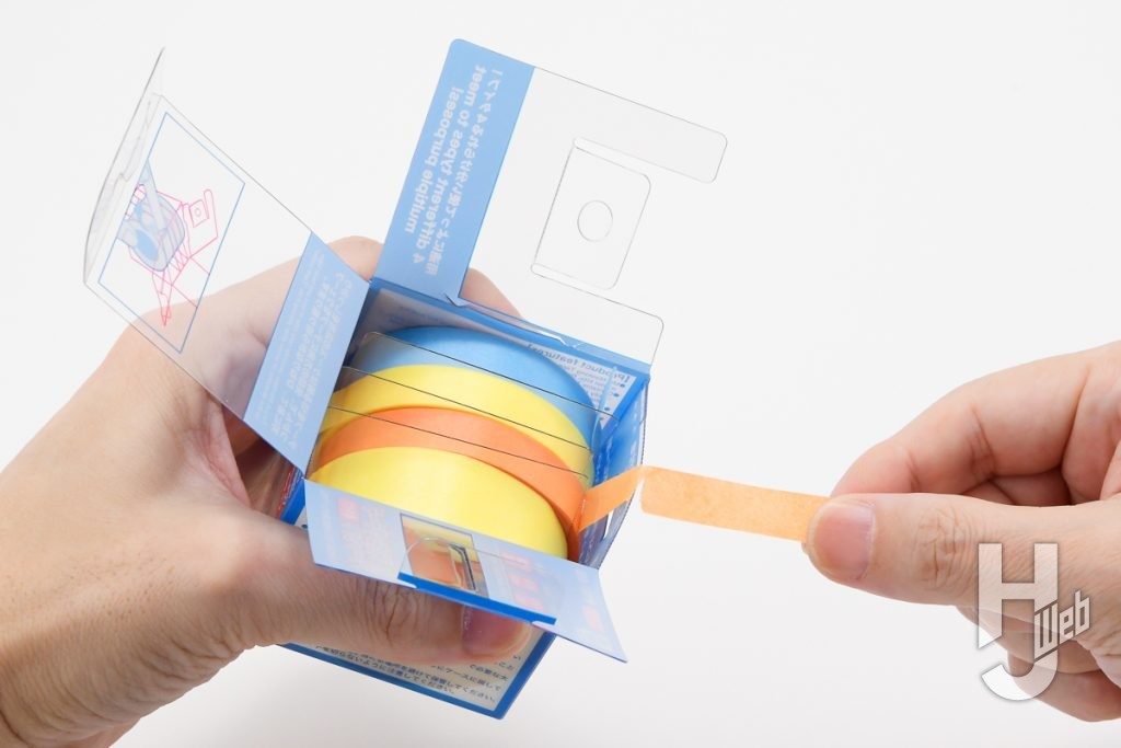 ▲各巻きの間に仕切りの入ったPETケース入り。ワイドタイプ同様にホコリを避けやすく、保管にも助かるスタイル。開口部のフチで簡易的なテープカットも可能です