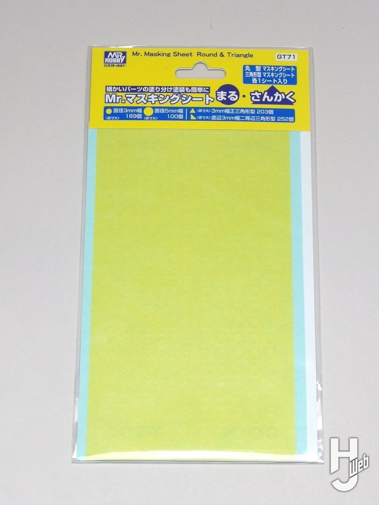 ▲丸は3mmと5mm径、三角は正三角形と二等辺三角形(底辺3mm幅)がカット済み。その形状ずばりをマスクするだけでなく、角やアールをいかして、マスク“隅”の処理の助けになります