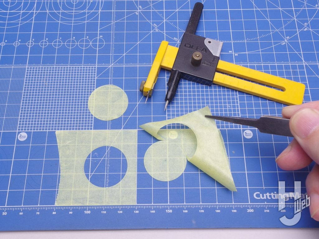 ▲幅広のテープは面をそのまま貼るだけで無く、カットして使うのにも便利です。例はコンパスカッターで円形に切り抜いたもので、円の内側も外側もマスク材として使用できます。より大きな円弧で切って、曲面にも馴染ませやすい帯にするなど応用ができます