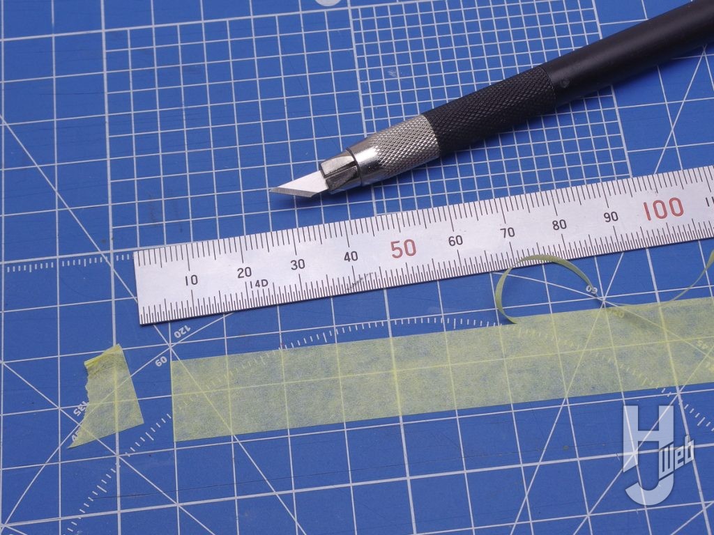▲塗り分けのマスキングではテープのフチを切り取ってシャープな切り口にしたところを境界に使うと、仕上がりがよくなります。テープのフチは微妙にヨレたりホコリがついたりすることもあるので、それを避けるわけです