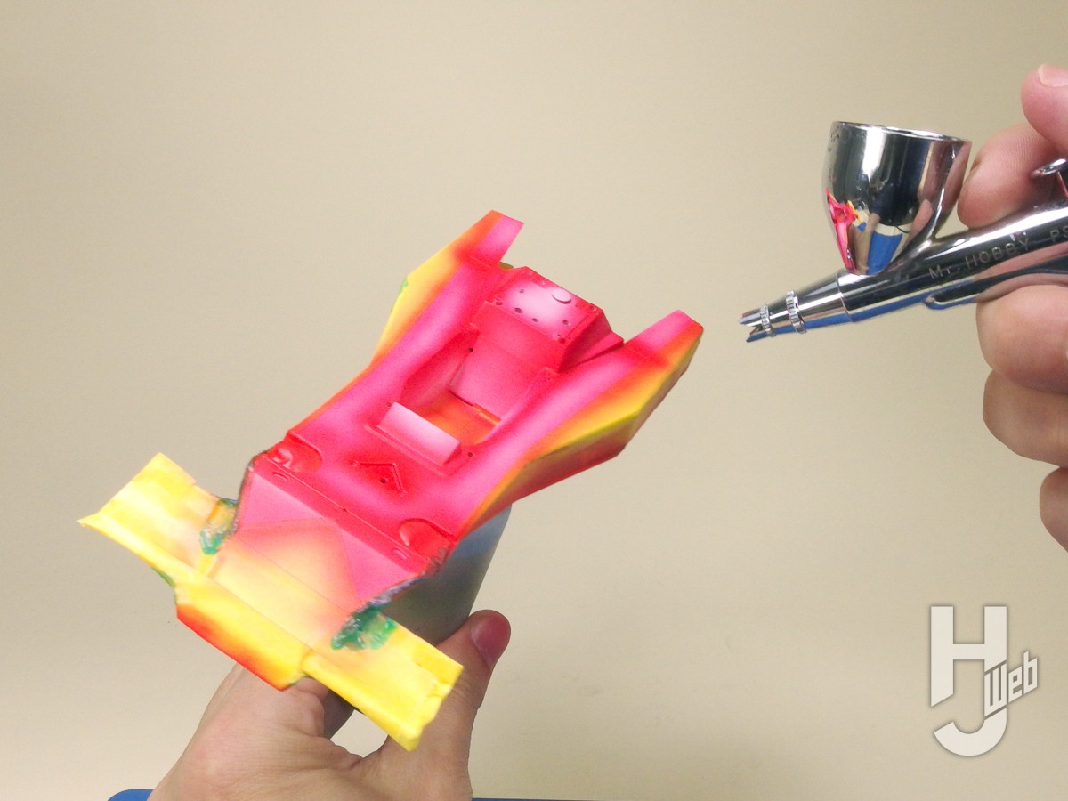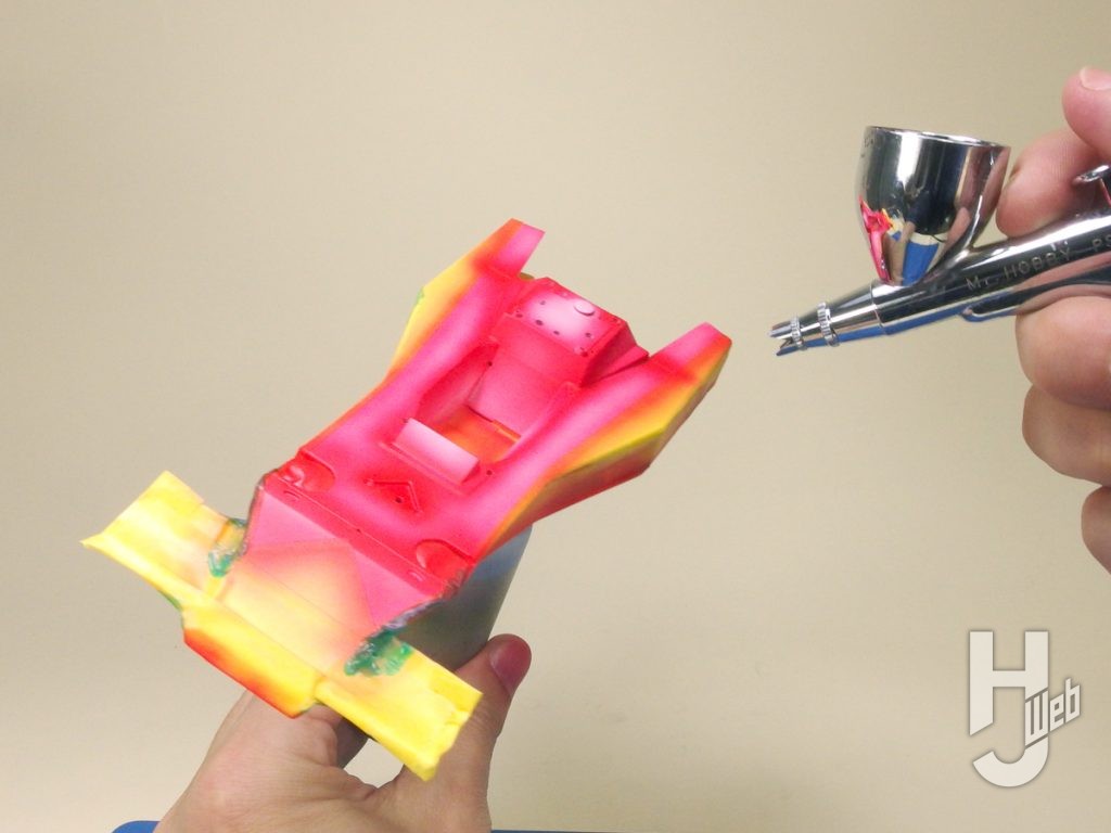 ▲マスキングをしたら、色分けの塗り重ね。ここではエアブラシで吹き付け塗装をしています
