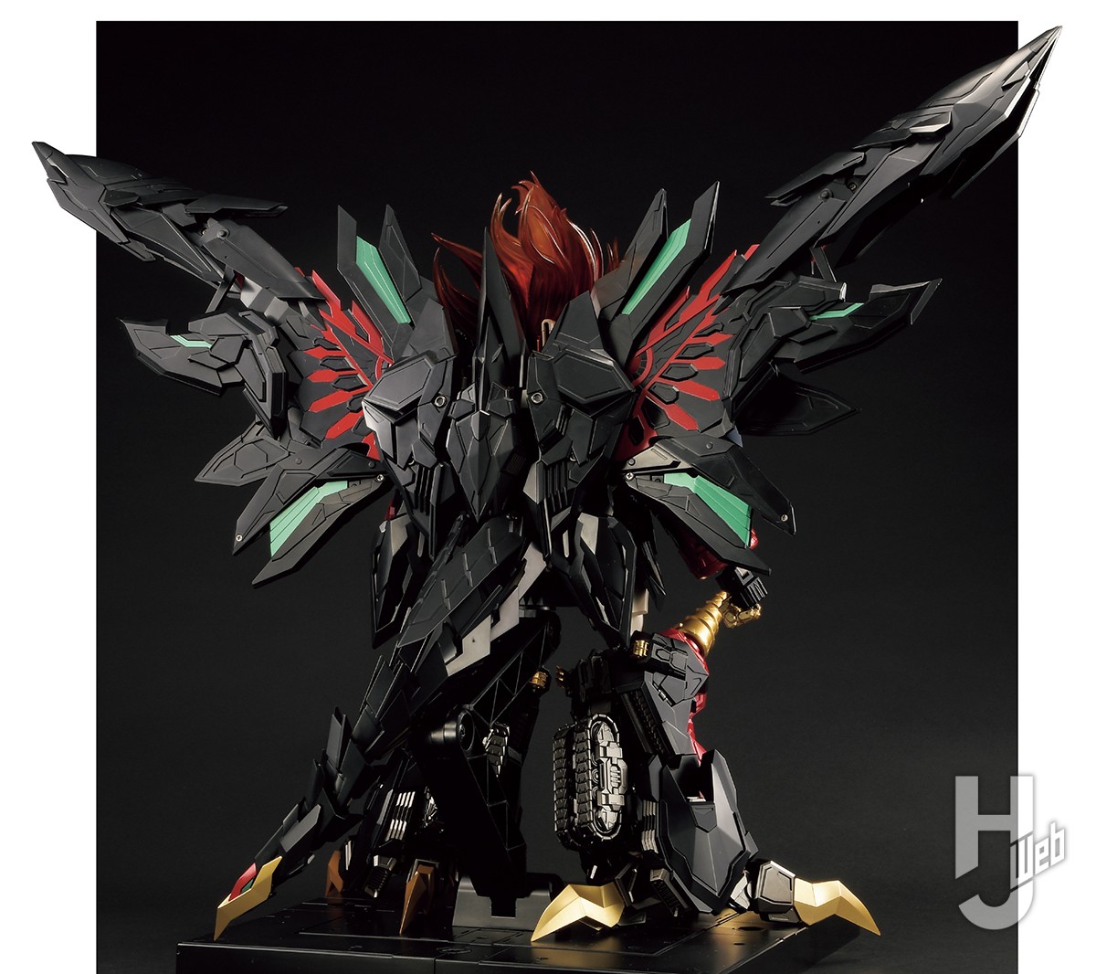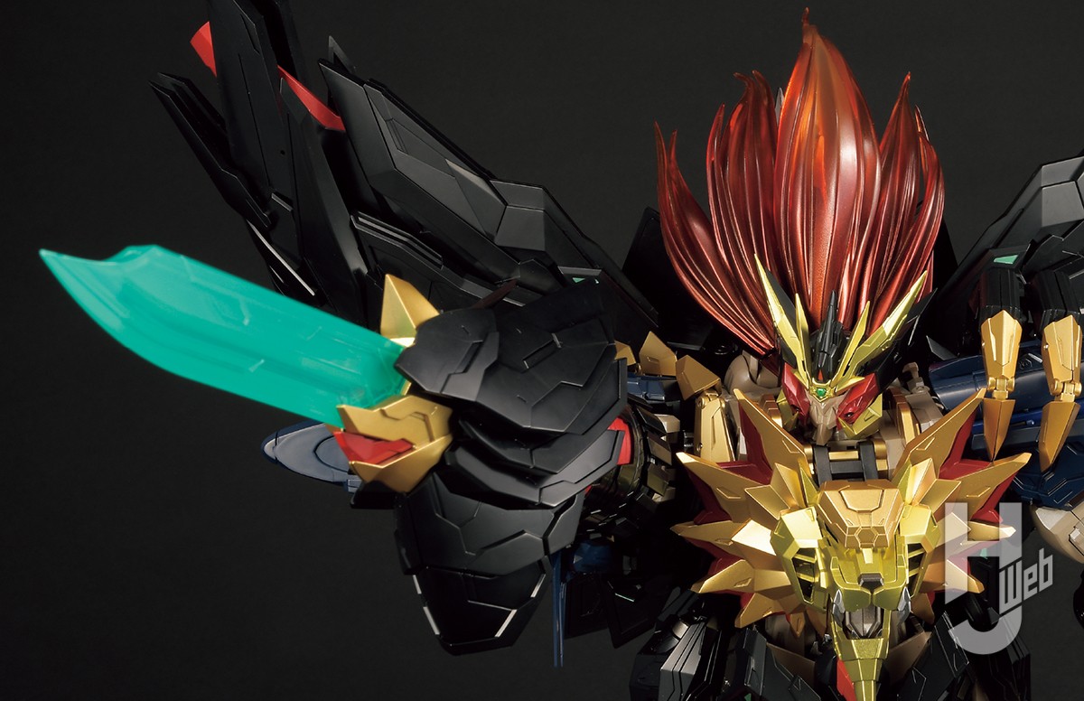 ▲ガジェットフェザーを展開させた状態での背面アングル。前作よりも可動部が増えただけでなく、開いた内部にも塗装が施され、面にメリハリをもたらしている。大型モデルならではの飽きさせない仕様だ