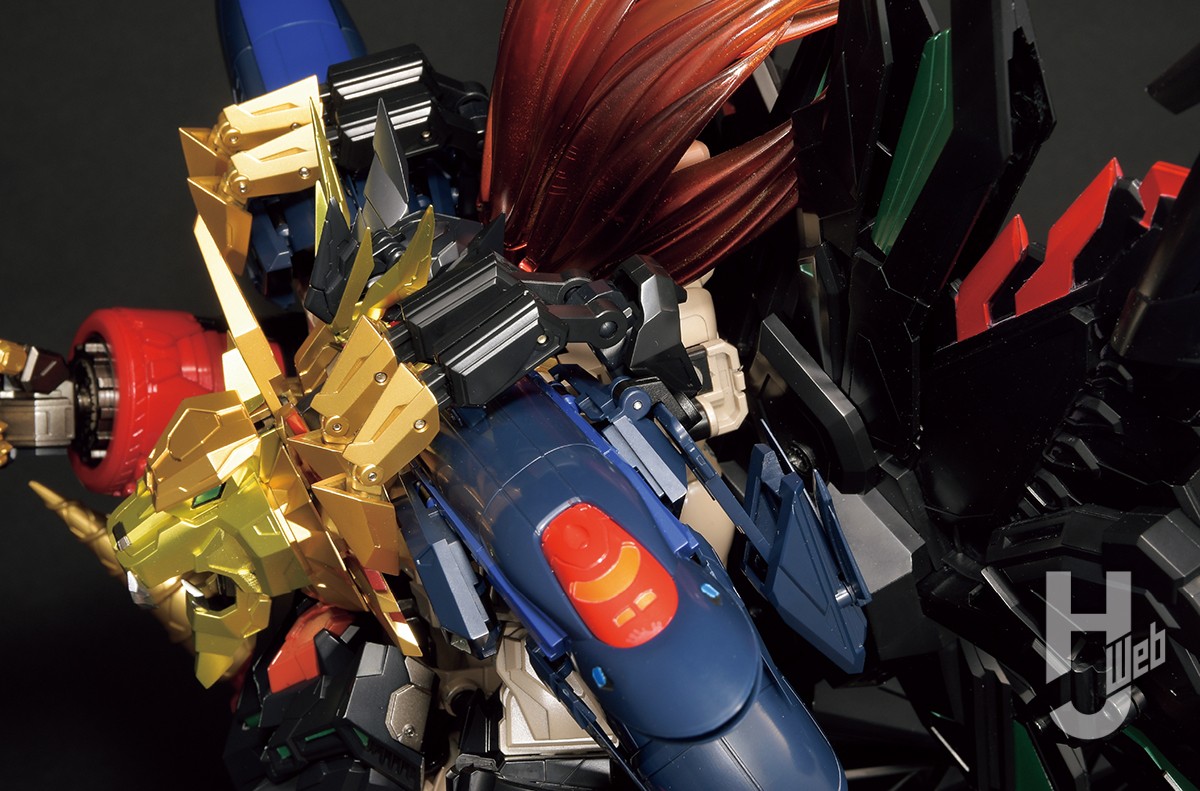 ▲ガジェットフェザーのクローがプロテクトガオーをしっかりとホールドしている。胴体とガジェットフェザーの間には背部に畳まれたガイガーの腕が見える