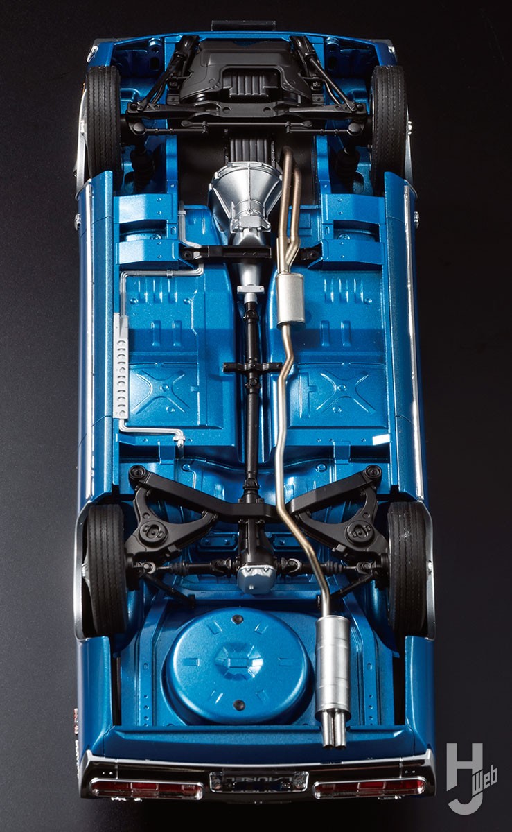 今回の製作はテストショットでグレー成型色でしたが、製品版は白成型色となりますので透け防止に黒サフからスタートし、ボディ色はGSIクレオスのGXメタルブルーに極微量のホワイトをプラスしています。ホワイトを足した影響なのかメタリックの目も落ち着き旧車のイメージに合いました。メッキパーツへの塗装はガイアノーツのマルチプライマーを塗布してから行っています。