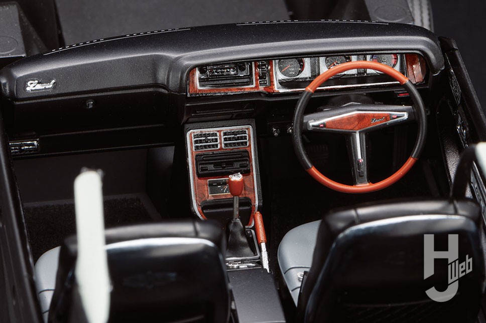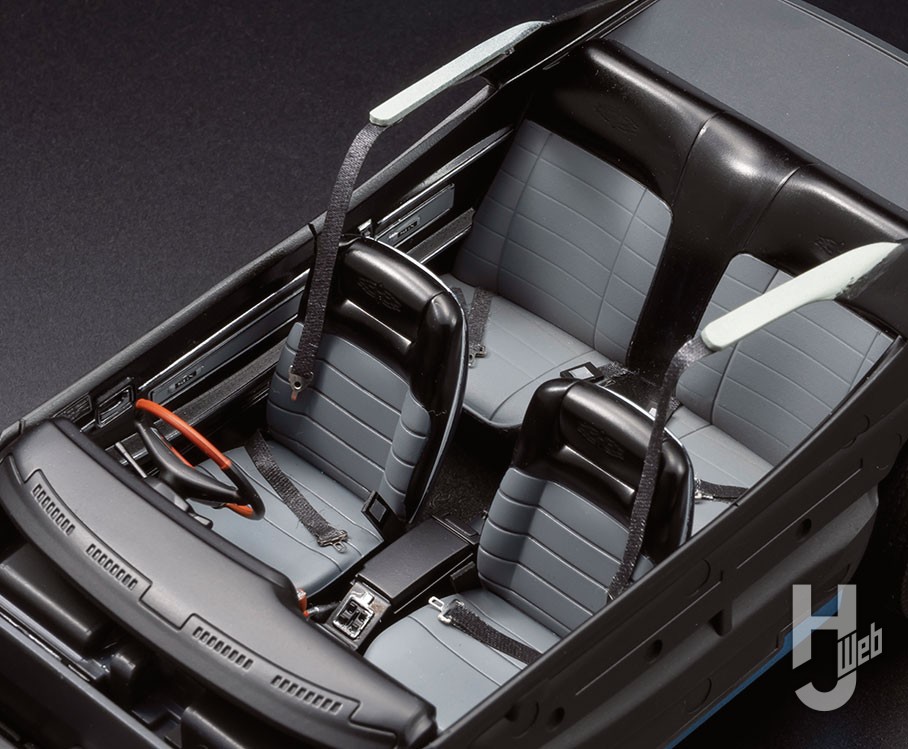 ボディ色がブルーメタリックの場合、シート色はブラック&グレー系になります。この際、ボディを乗せると室内が暗くなることを見越して、少し明るめのグレーにしておくことをおすすめします。フロントシートのホワイトラインはエナメル塗料を塗り、拭き取りで対応。ドアトリム部のシルバーデカールはミスターホビーマーカーのシルバーです。さらに定番加工としてシートベルトを追加しましたが、フロントの3点式ベルトは肩ベルトがルーフ部に取り付けられており、現在の3点式とは形状が違っています。本来ならボディルーフ内部にシートベルトを付けると良いのですが、ボディ脱着の必要もありますので、室内のトリムを延長してシートベルトとアシストグリップを追加してみました。