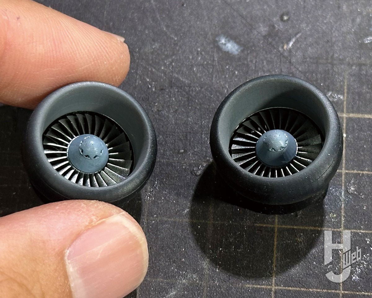 またエンジンですが、キットのエンジンファンブレードは、奥まったパーツにフィンがモールドされているのみですが、モデリンク製のパーツは、ファンブレードが1枚1枚薄く精密に成型されています。さらに、エンジンのインテーク部分もセットになっており、ファンブレードを塗装後に組み込める、塗り分けにも配慮したパーツ分割となっています。このパーツに交換するだけで、機体の精密感がかなり向上します。